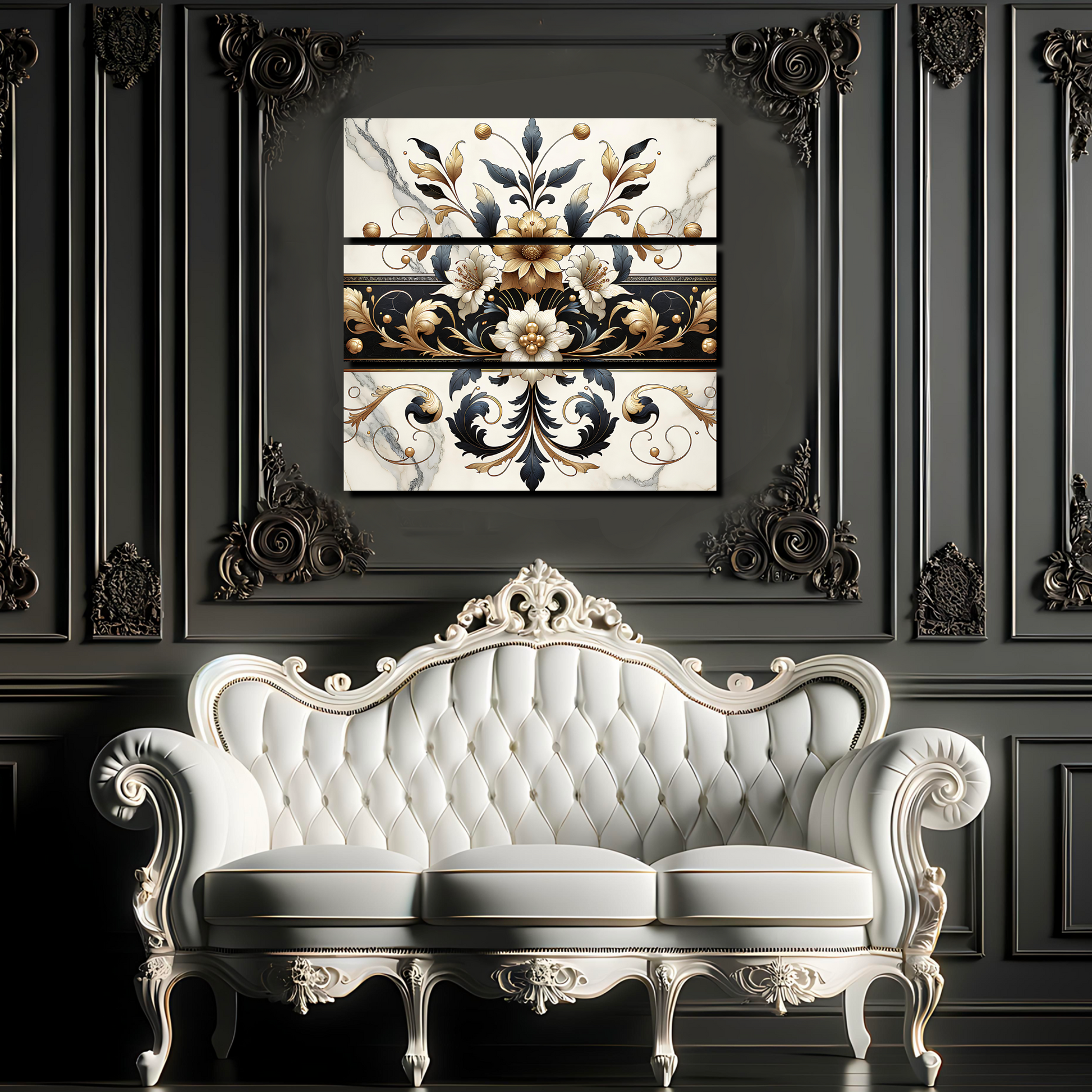 Gilded Reverie is a one-of-a-kind fine art statement—where timeless baroque elegance meets contemporary boldness in a lavish composition of marble, midnight noir, and burnished gold. Floral flourishes unfurl like a whispered sonnet across stone and shadow, evoking refinement, romance, and power in equal measure.