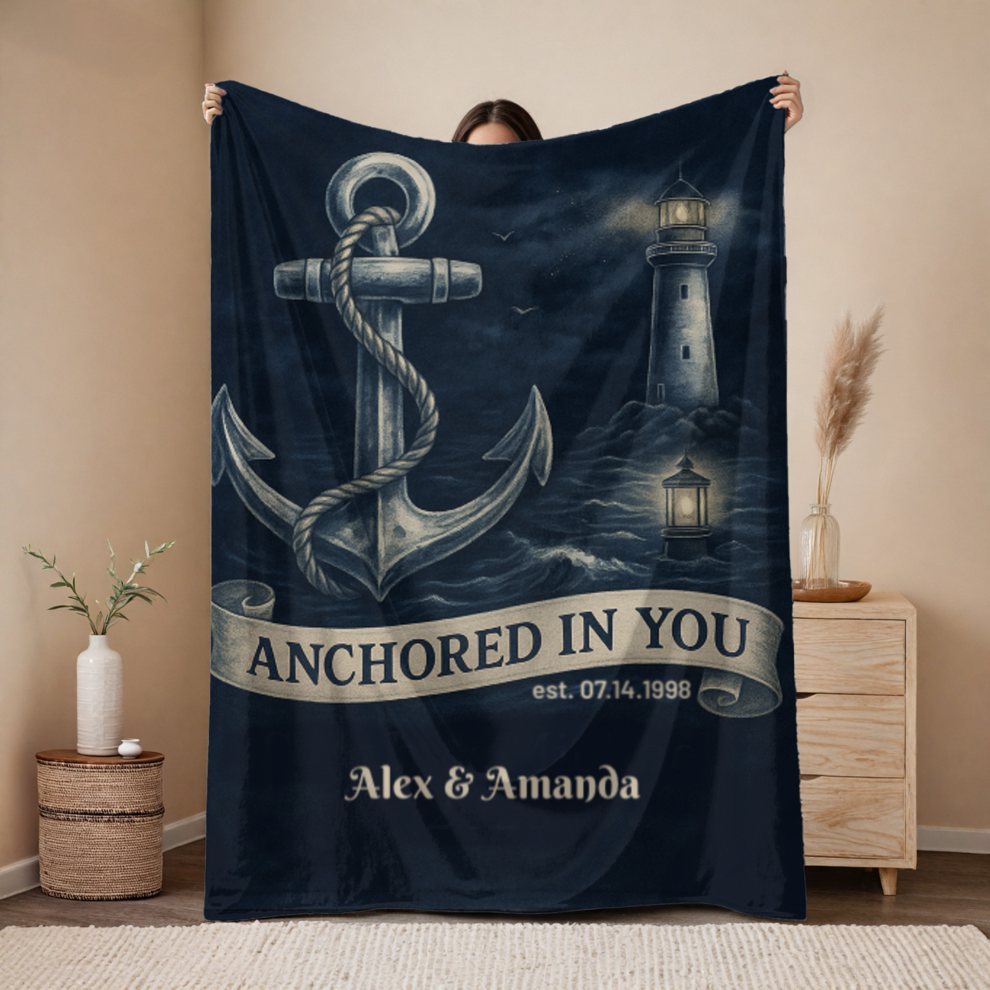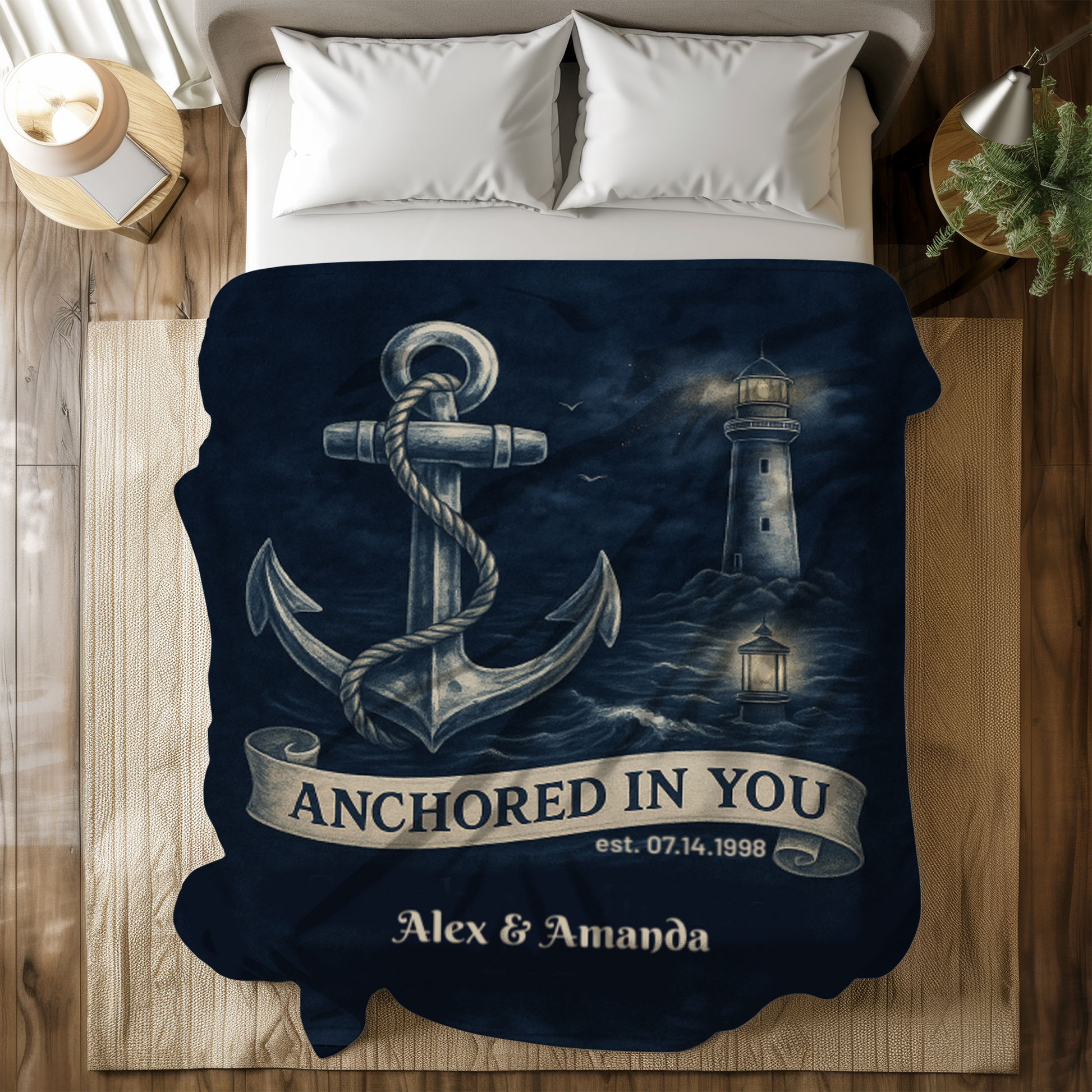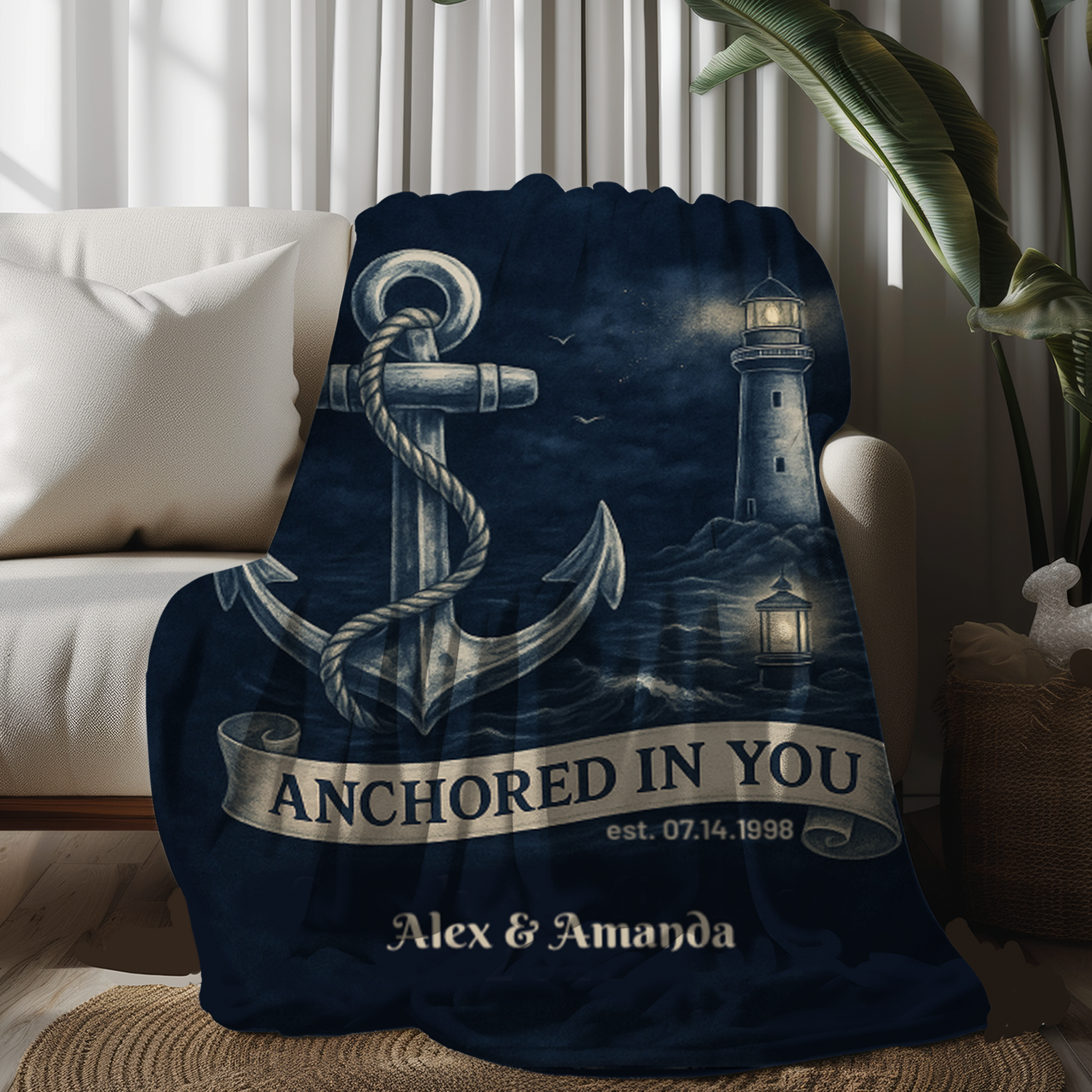 Celebrate your lasting bond with this stunning nautical-themed blanket, featuring a detailed anchor and lighthouse design. Personalized with your names and a meaningful date, it’s a heartfelt gift for weddings, anniversaries, or just because.