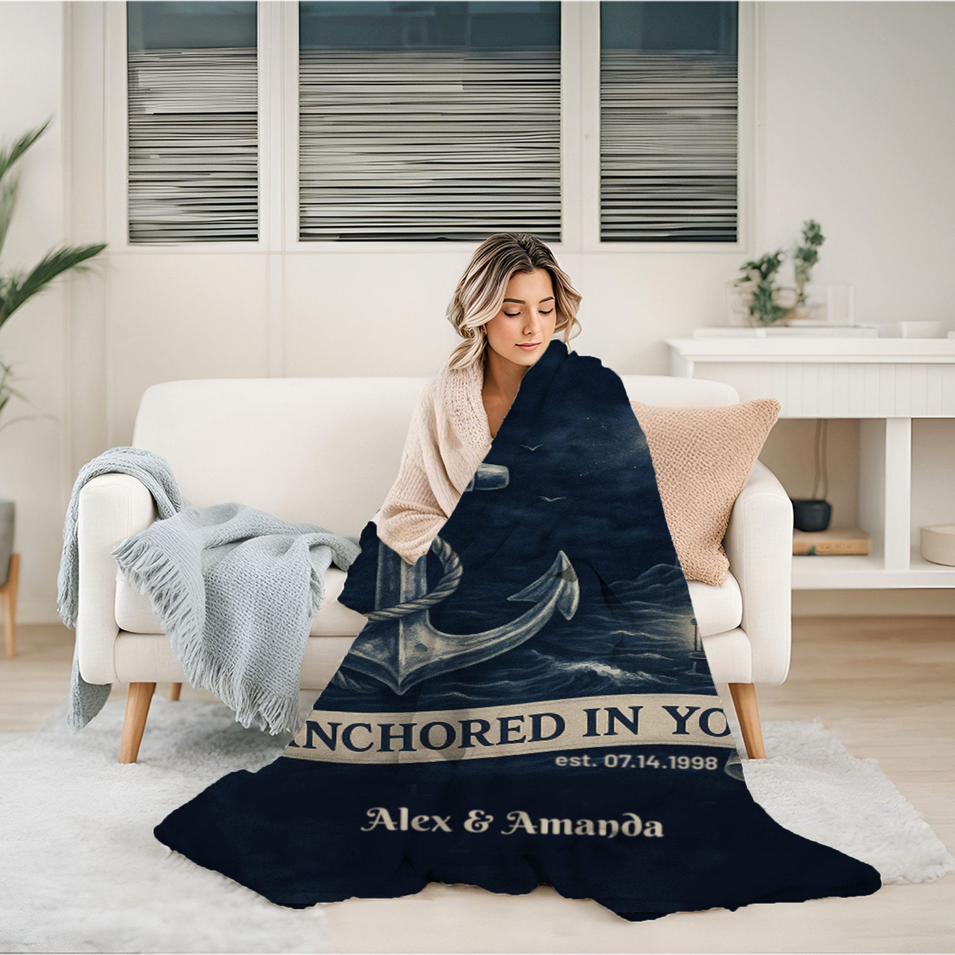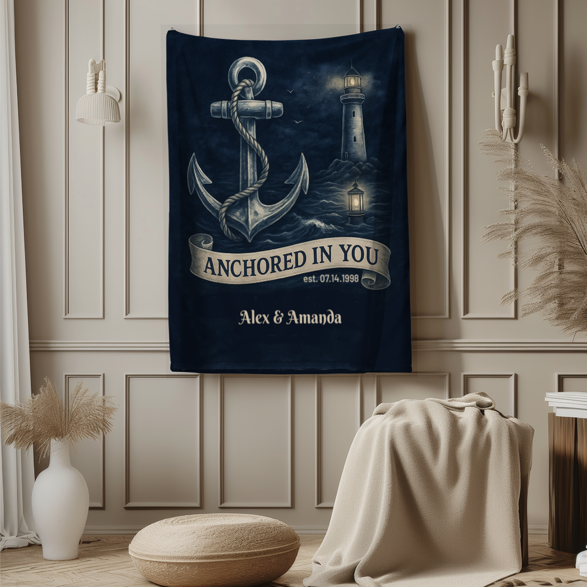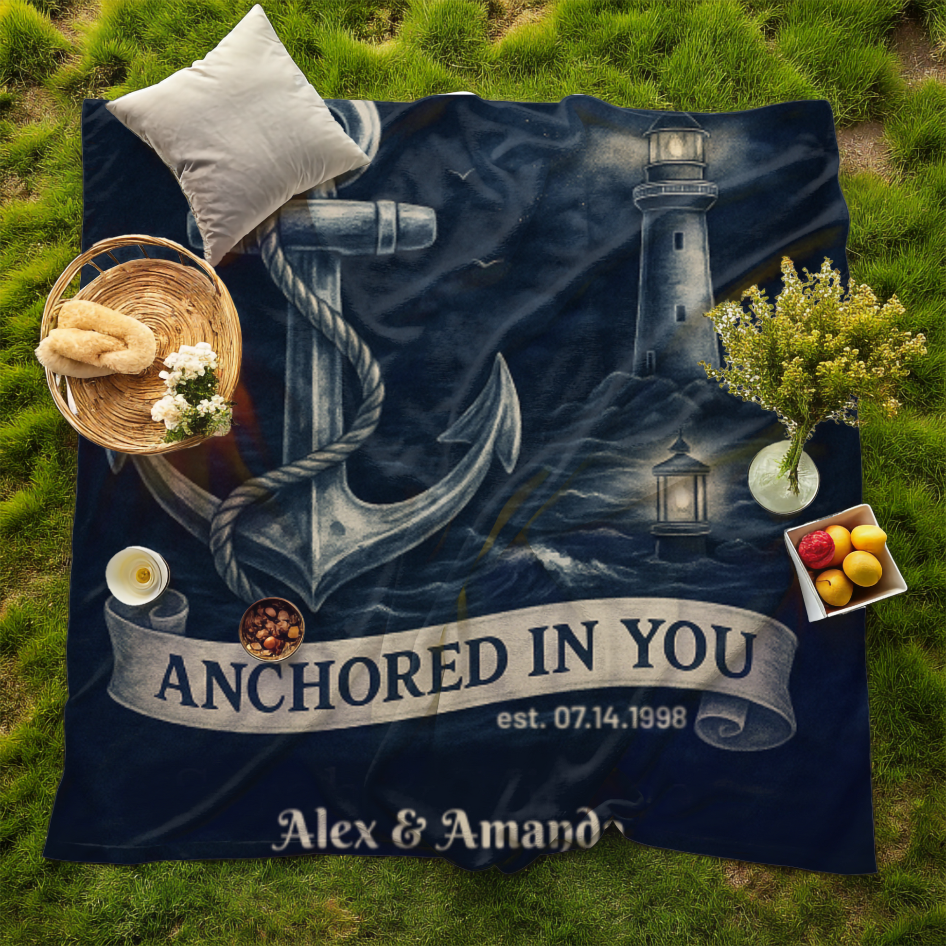 Celebrate your lasting bond with this stunning nautical-themed blanket, featuring a detailed anchor and lighthouse design. Personalized with your names and a meaningful date, it’s a heartfelt gift for weddings, anniversaries, or just because.