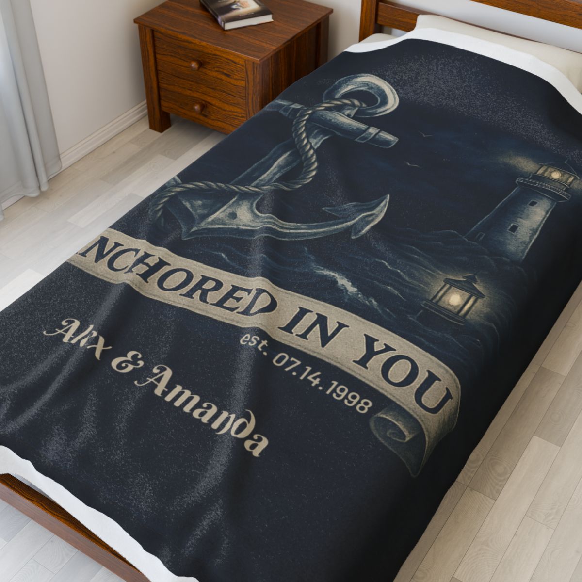Anchored in You Blanket – Personalized Nautical Couple Throw with Lighthouse and Names