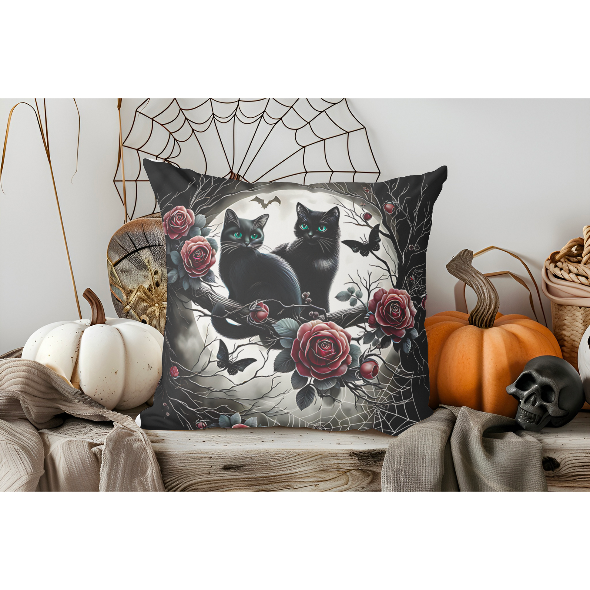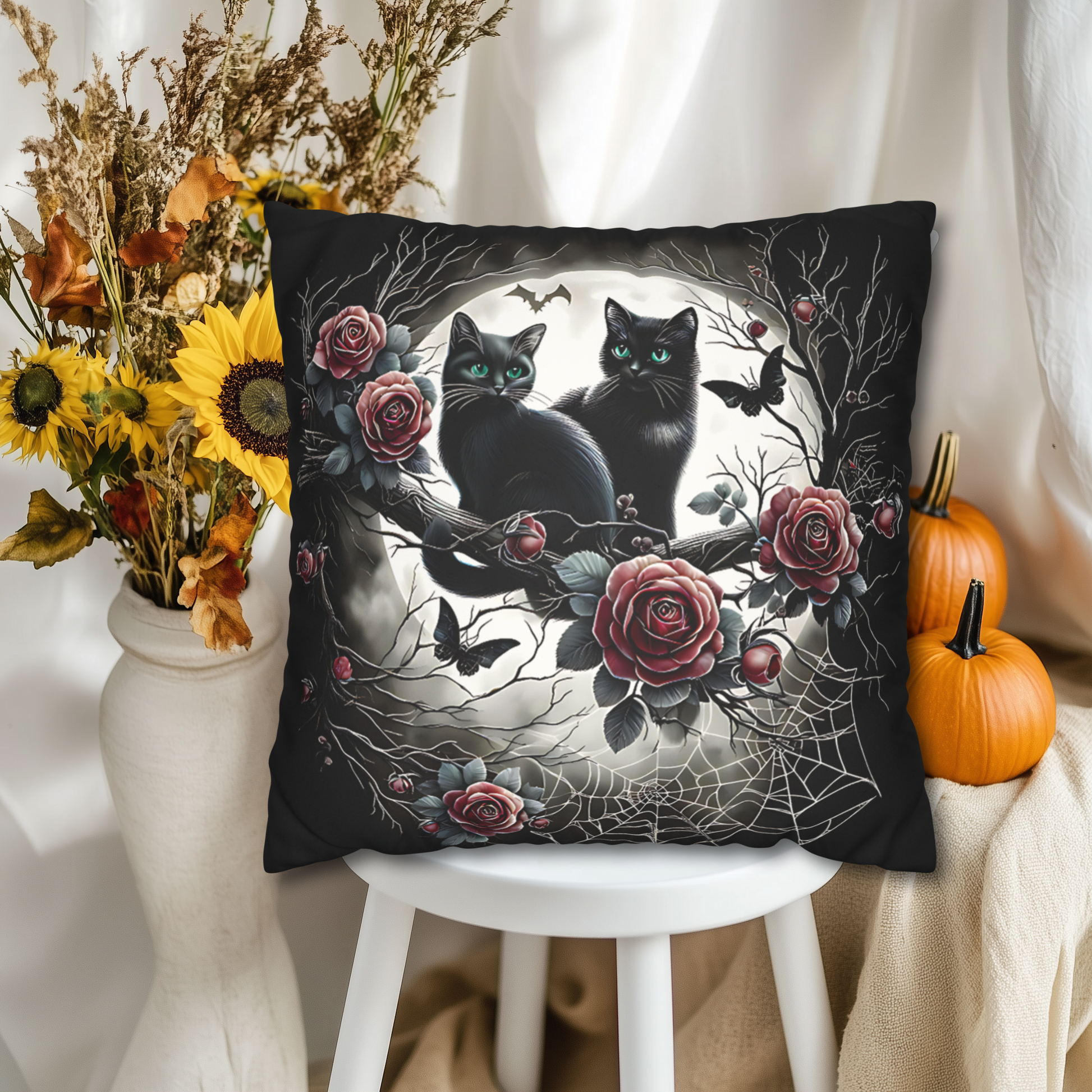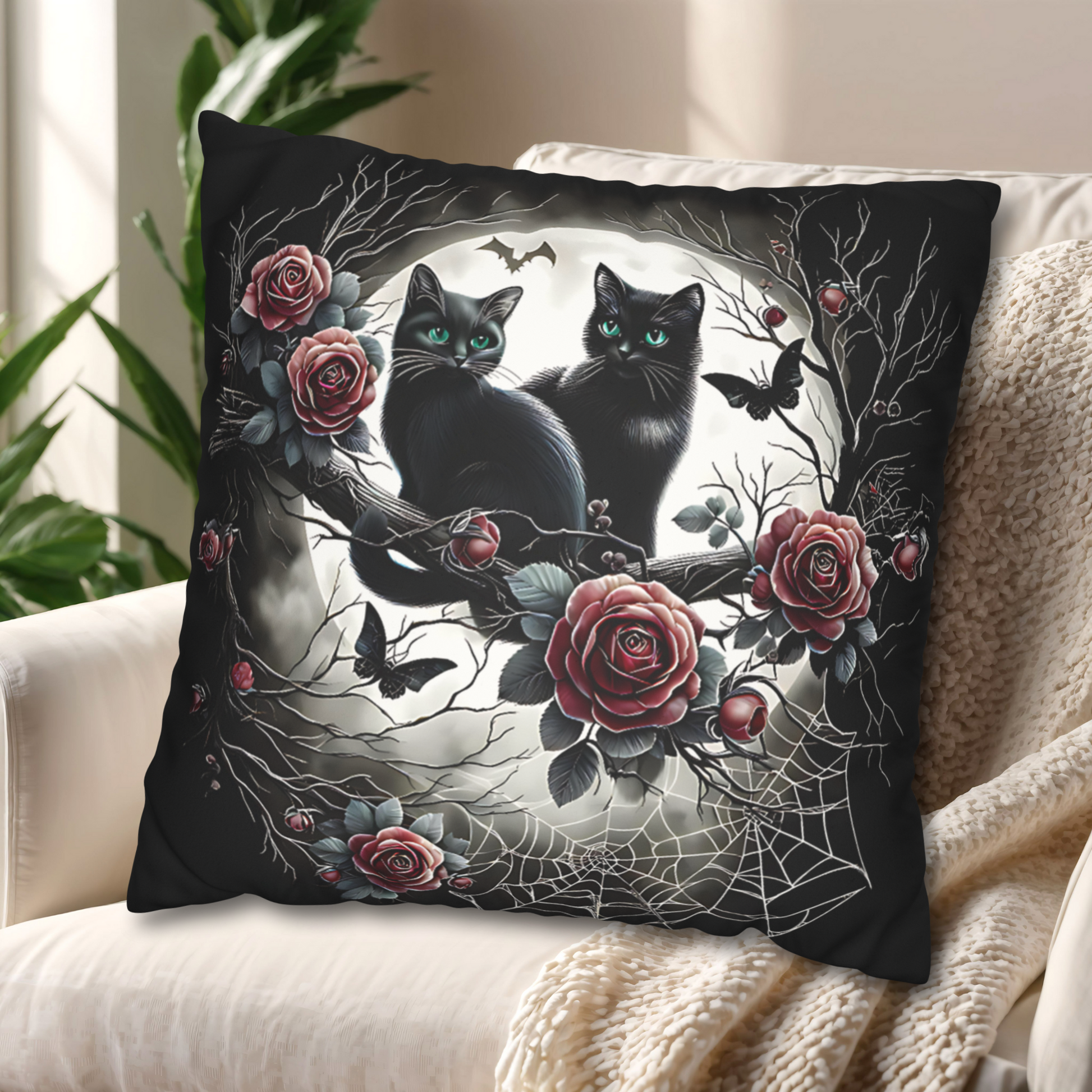 Bring a touch of dark romance and mystery to your home with this stunning gothic pillow cover, featuring black kittens with emerald eyes perched among moonlit branches, deep red roses, and delicate spiderwebs. rinted on luxuriously soft faux suede, this decorative pillow cover is perfect for adding drama and elegance to your sofa, bed, or cozy reading nook.