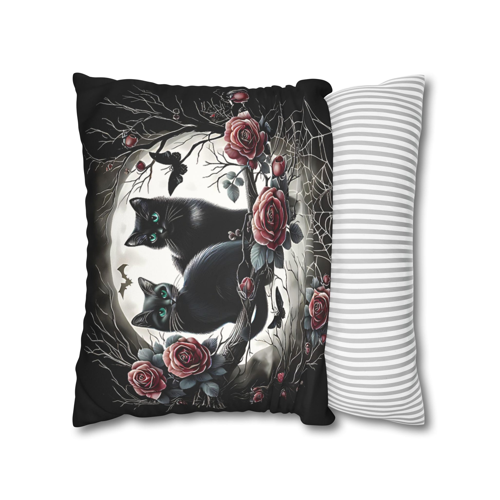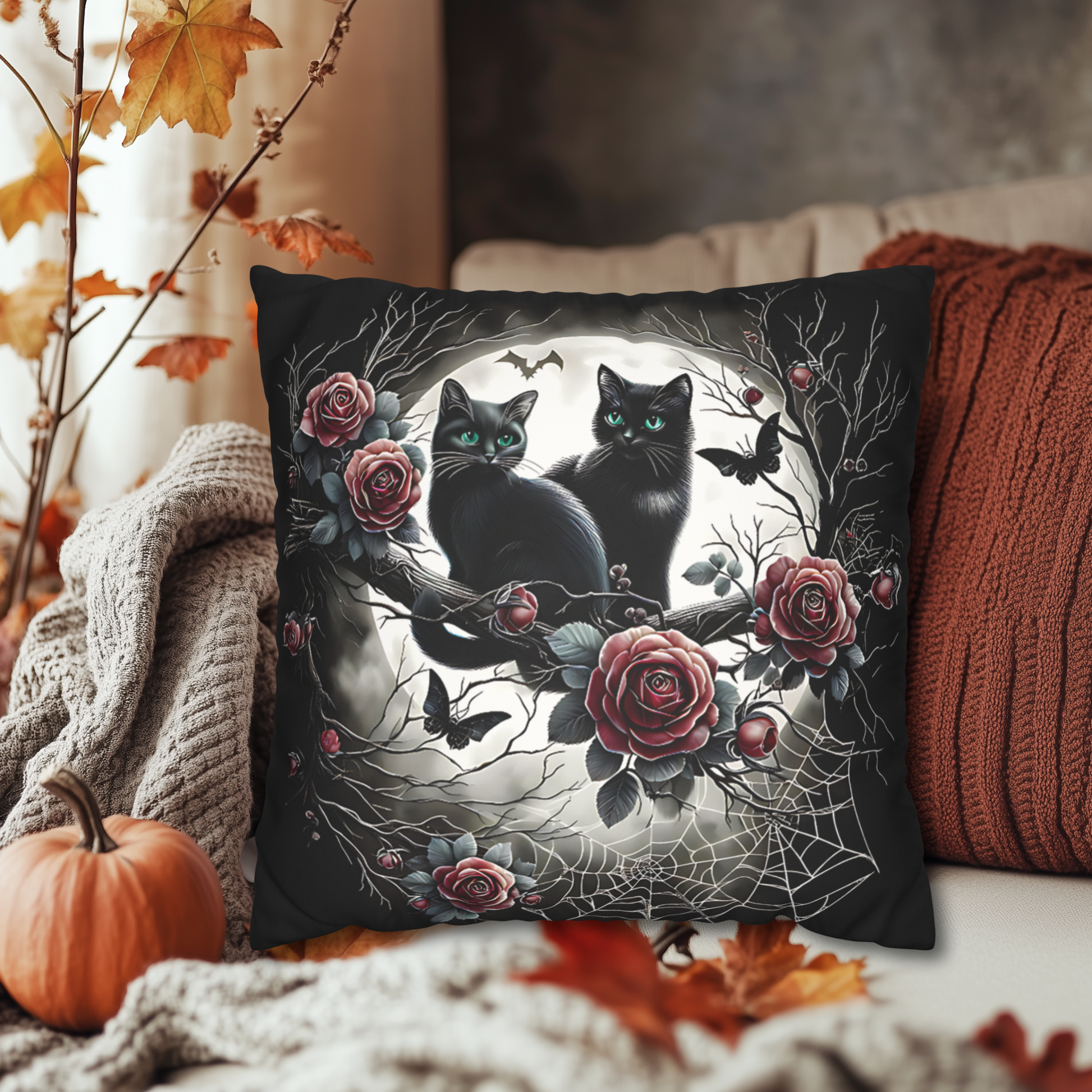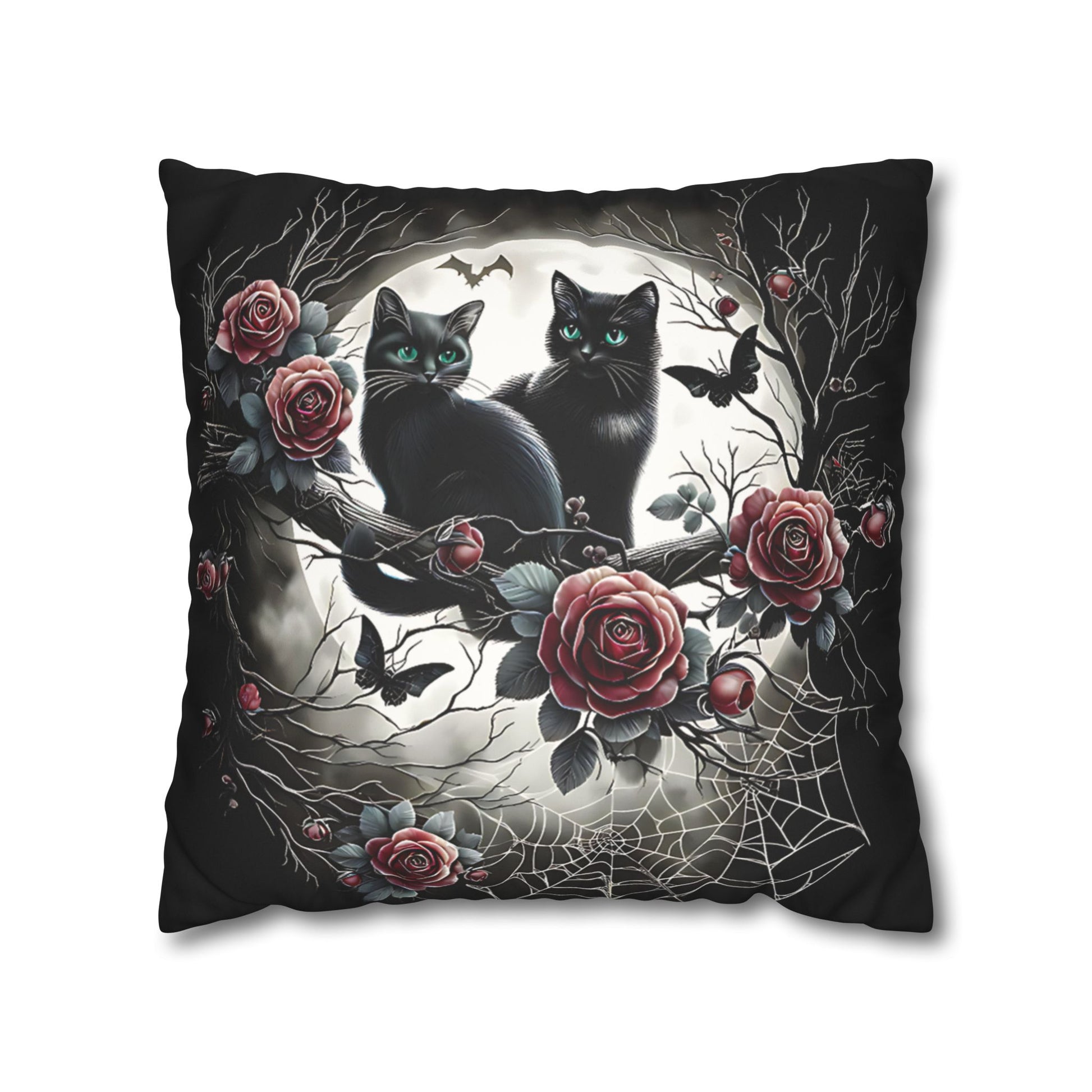 Bring a touch of dark romance and mystery to your home with this stunning gothic pillow cover, featuring black kittens with emerald eyes perched among moonlit branches, deep red roses, and delicate spiderwebs. rinted on luxuriously soft faux suede, this decorative pillow cover is perfect for adding drama and elegance to your sofa, bed, or cozy reading nook.