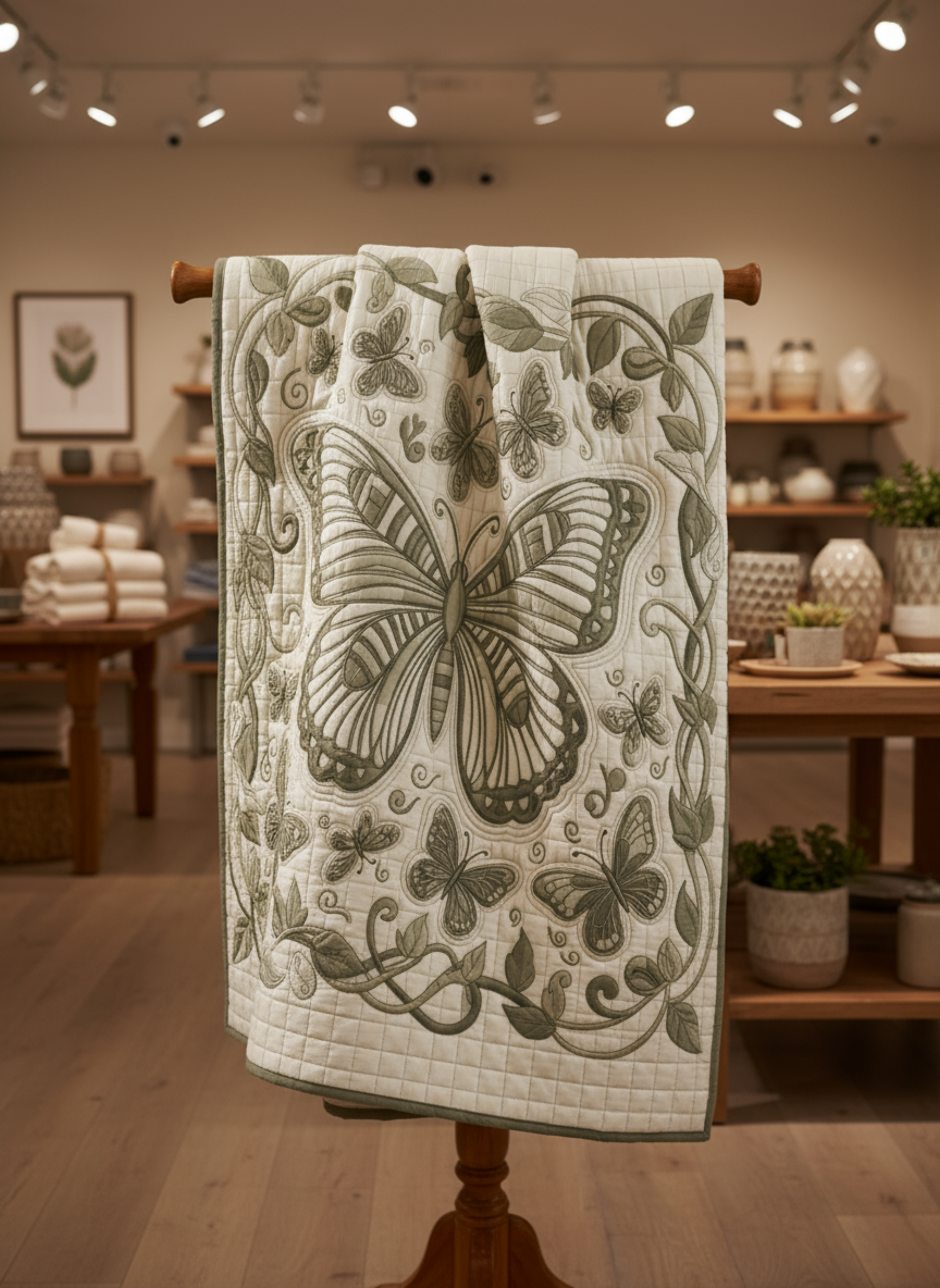 Featuring an intricate butterfly surrounded by trailing vines and soft botanical detailing, this elegant throw blends comfort with timeless style. The top side showcases the richly detailed design, while the underside offers luxuriously soft sherpa fleece for extra warmth and coziness.