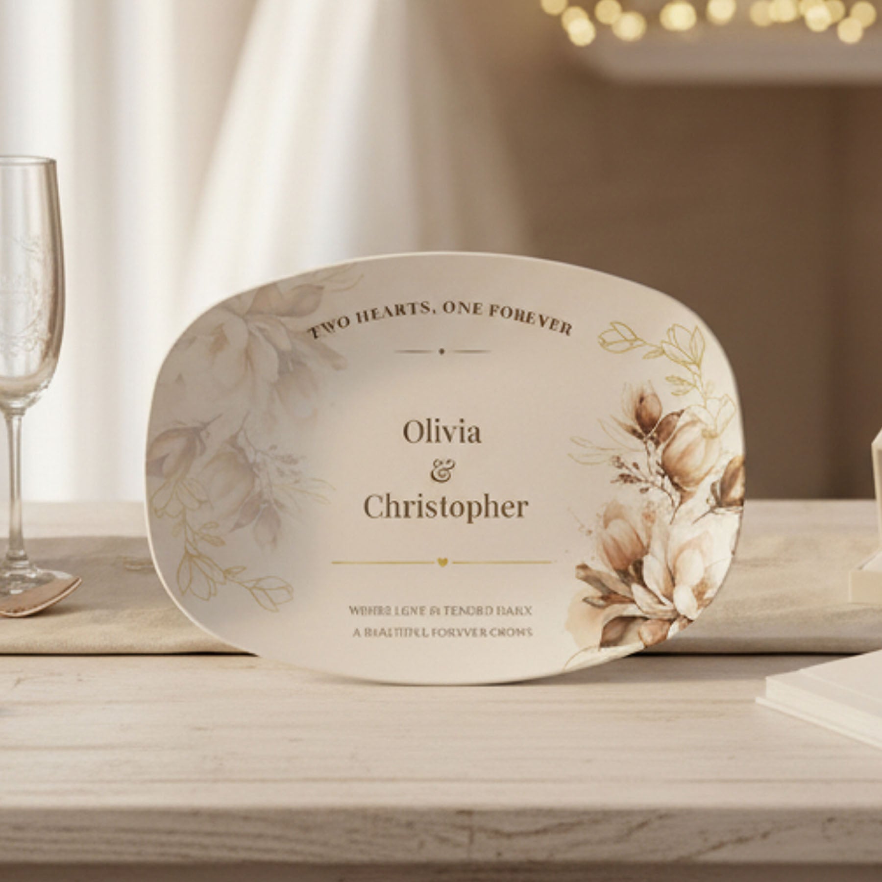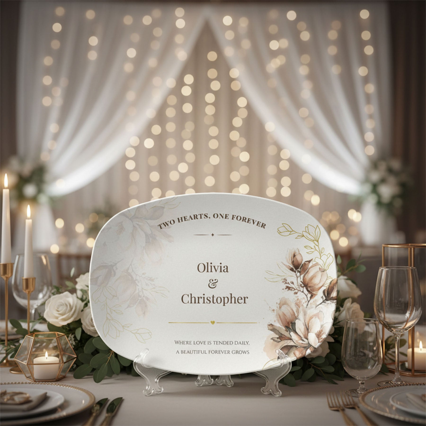 This personalized wedding platter features elegant magnolia florals, refined typography, and custom names and date — creating a heartfelt gift they’ll treasure for anniversaries, newlywed celebrations, bridal showers, or as a centerpiece in their forever home.