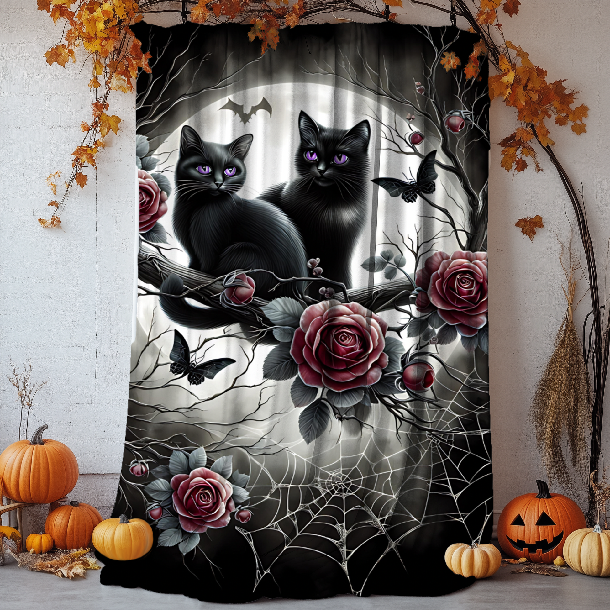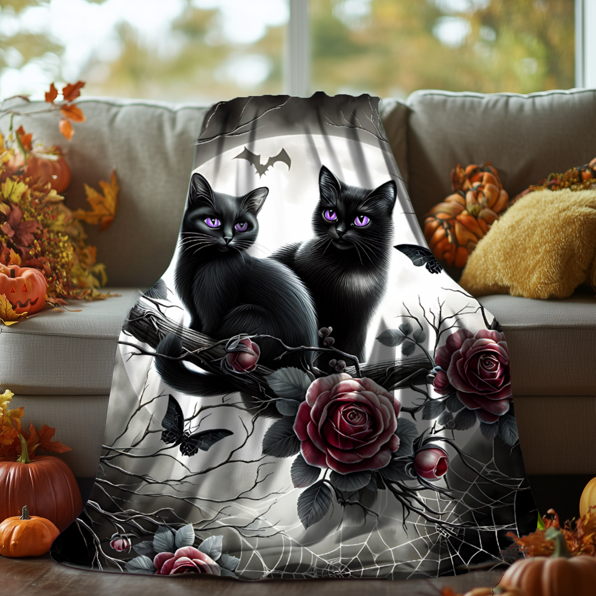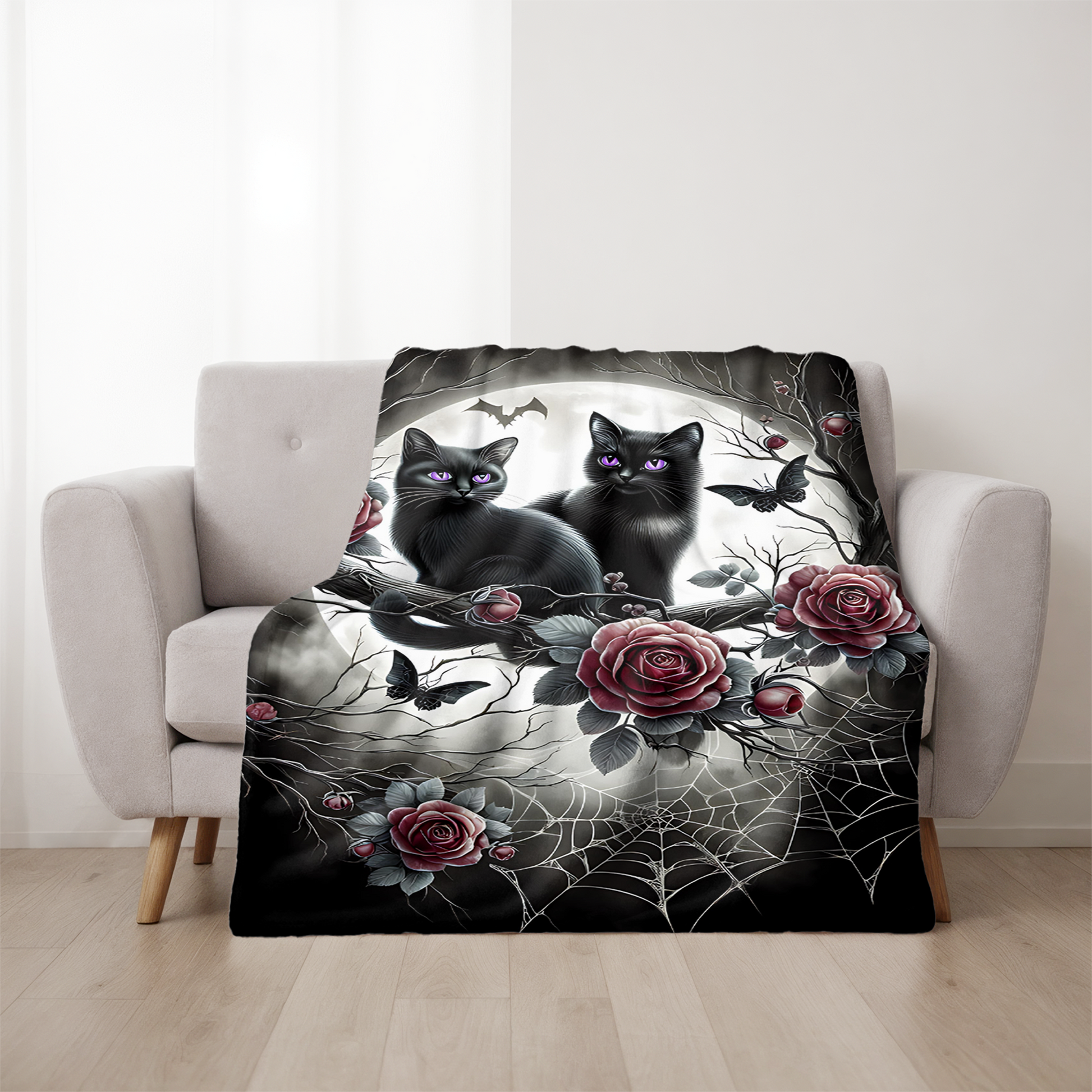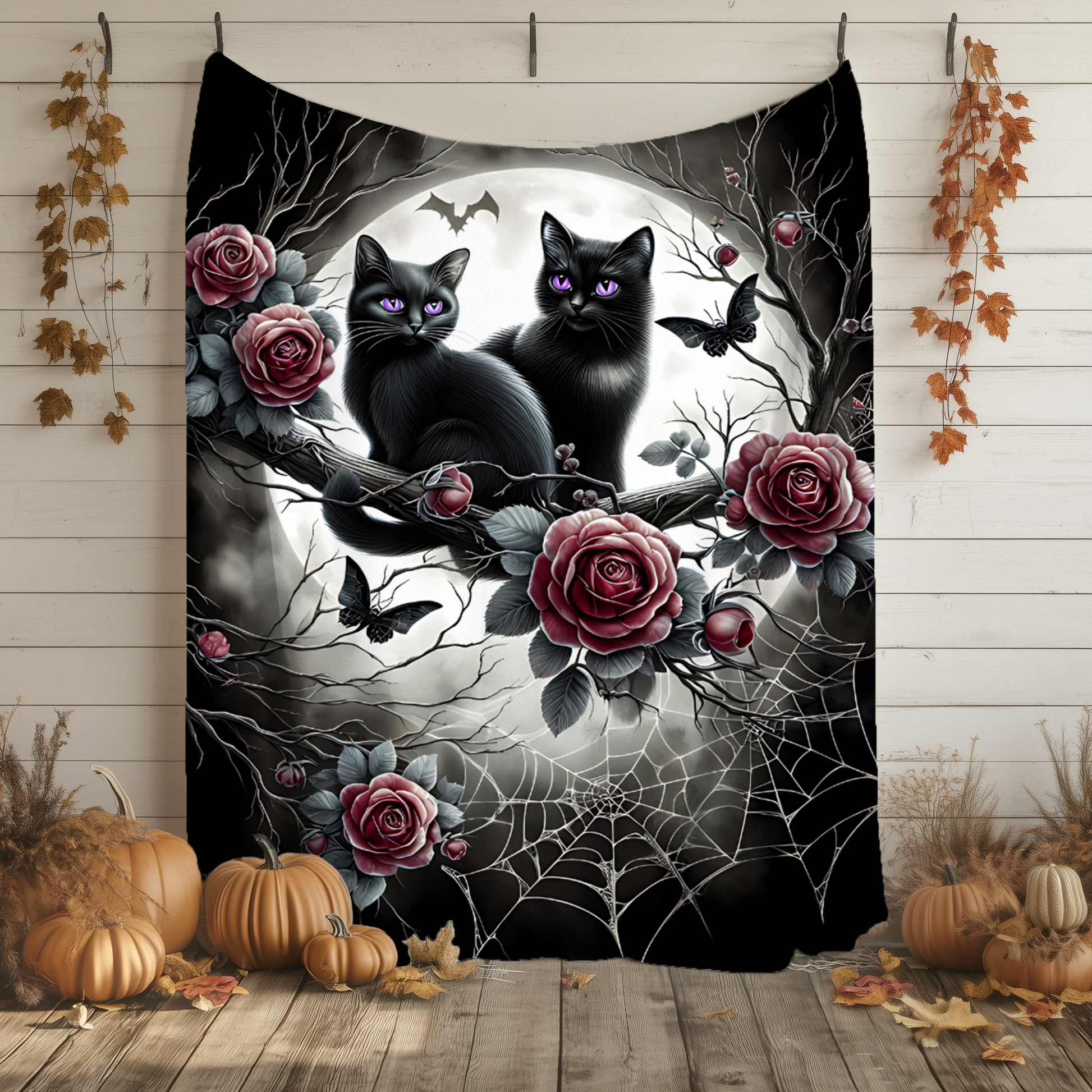 Add a touch of gothic charm and whimsy to your space with this enchanting velveteen blanket, featuring two black kittens with radiant amethyst-violet eyes, perched among moonlit branches, dark red roses, intricate spiderwebs, and delicate gothic details.