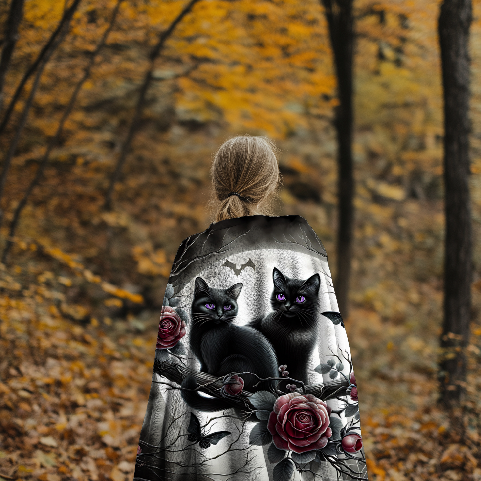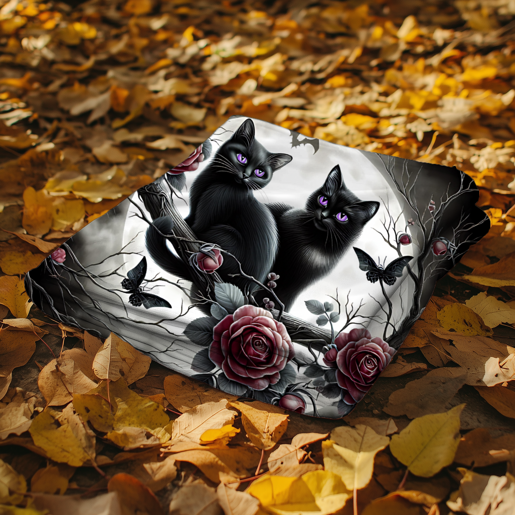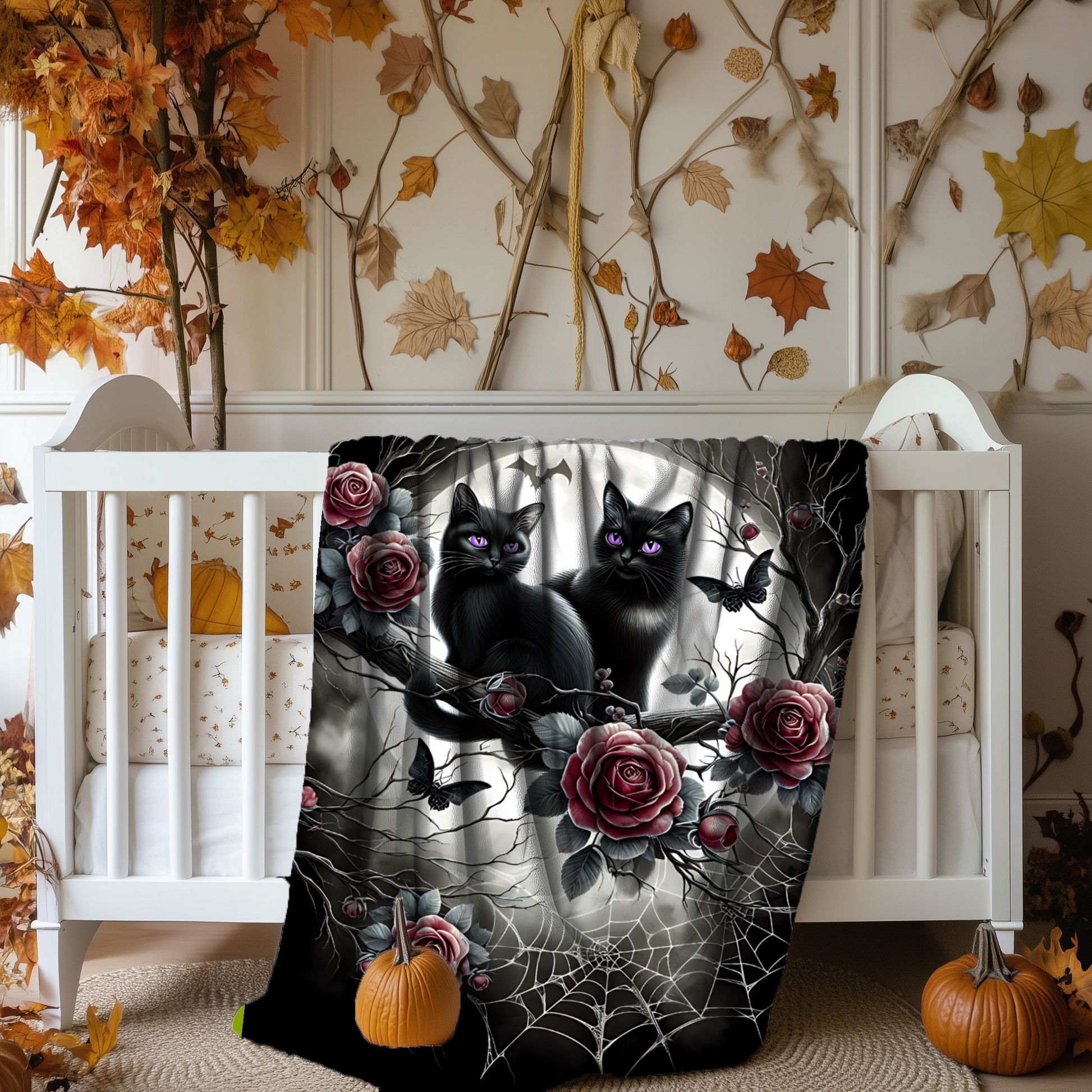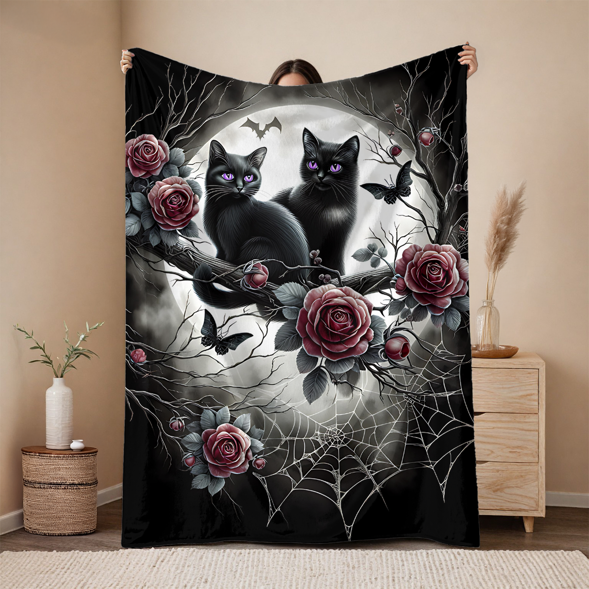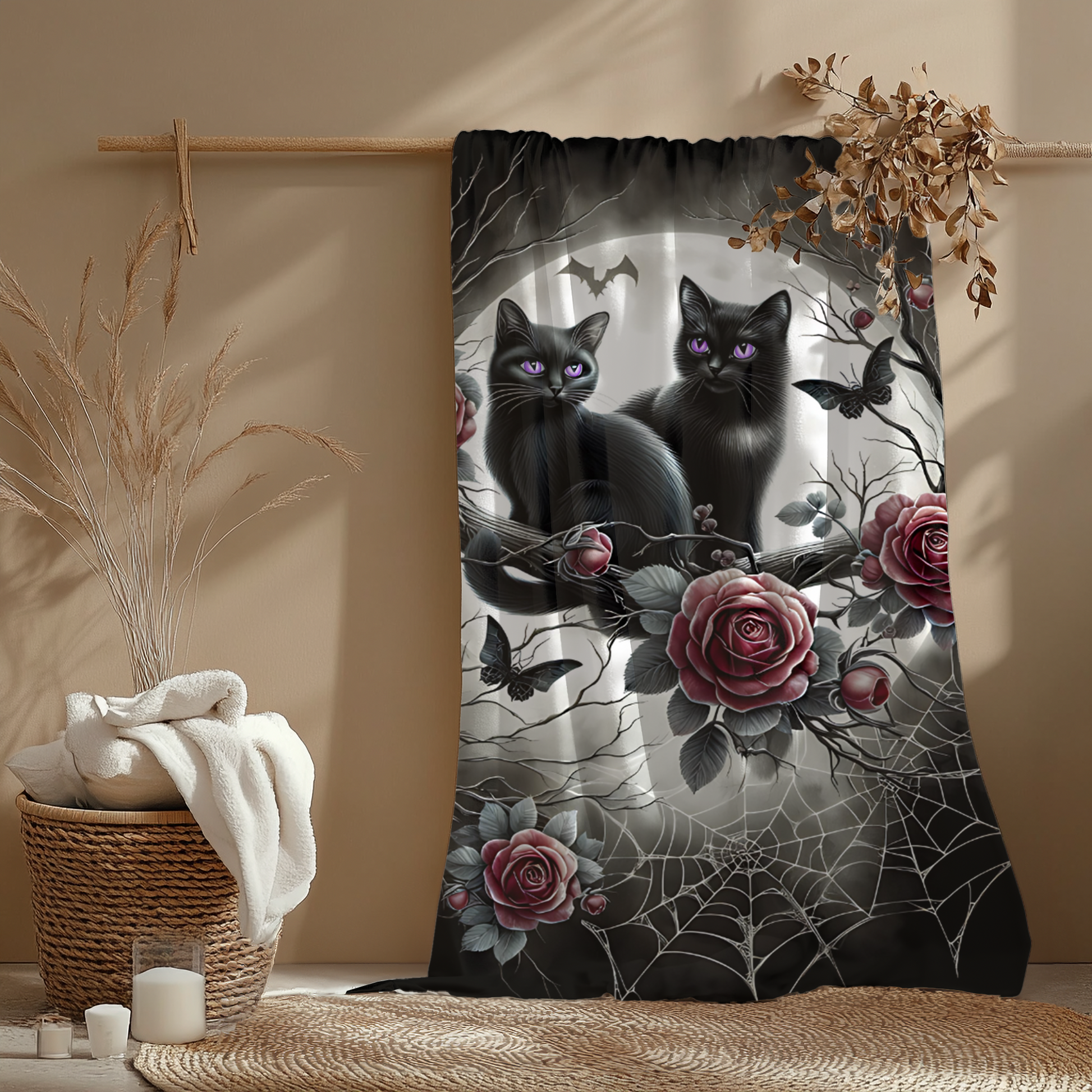 Add a touch of gothic charm and whimsy to your space with this enchanting velveteen blanket, featuring two black kittens with radiant amethyst-violet eyes, perched among moonlit branches, dark red roses, intricate spiderwebs, and delicate gothic details.