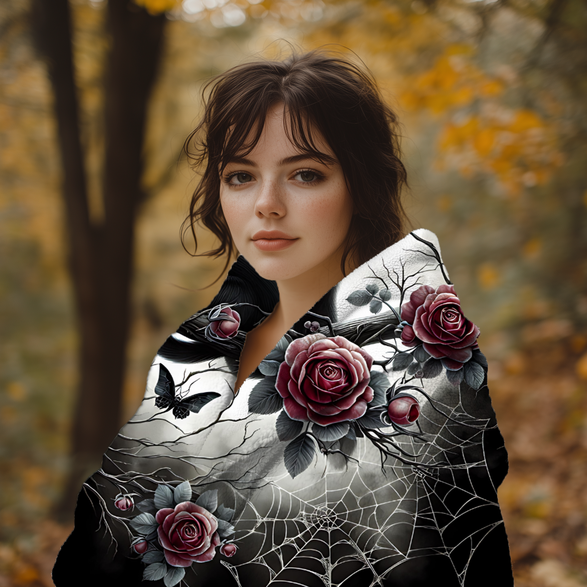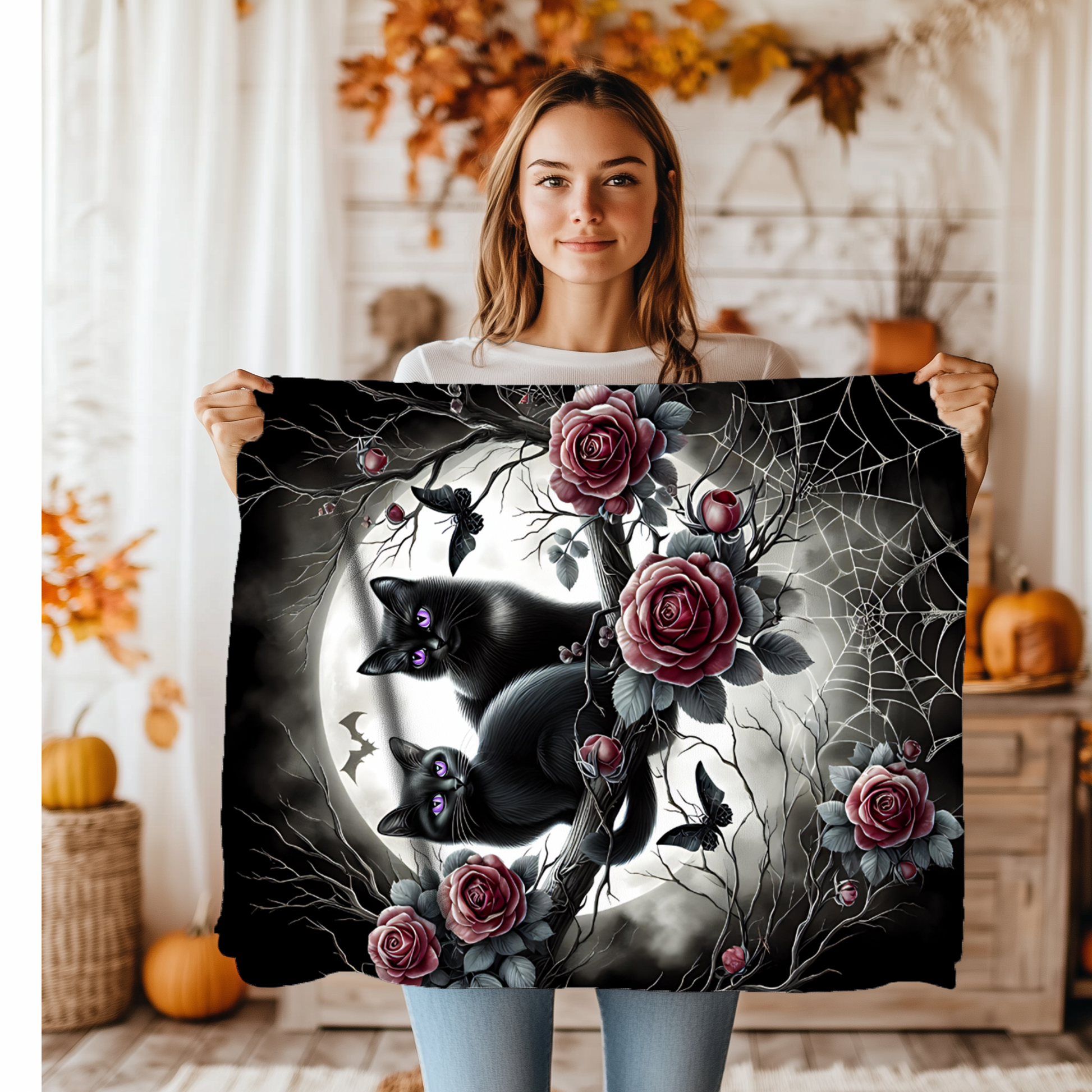 This cozy throw combines dark romance and playful mystery, perfect for Halloween, gothic home decor, or curling up with your favorite book on a crisp autumn night.