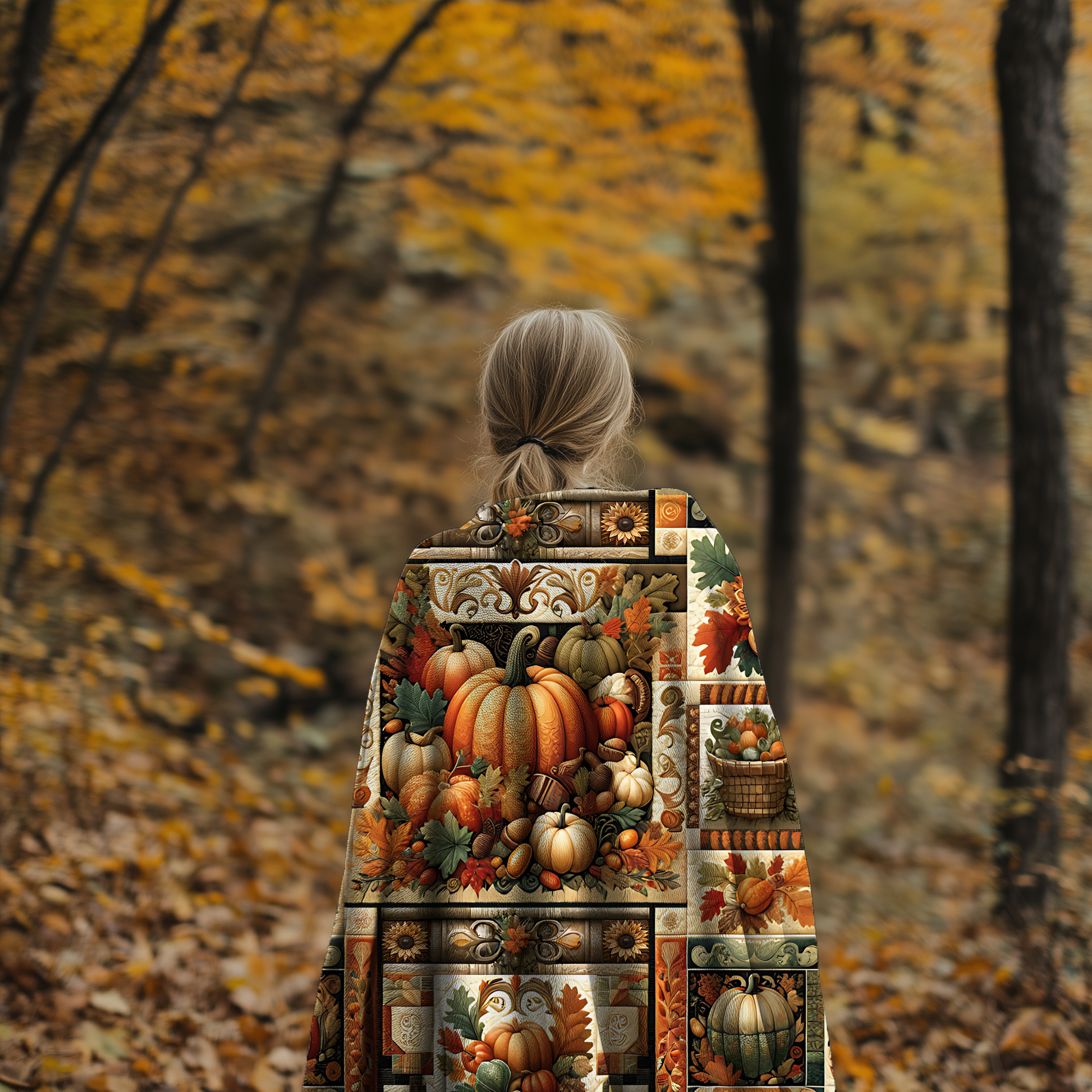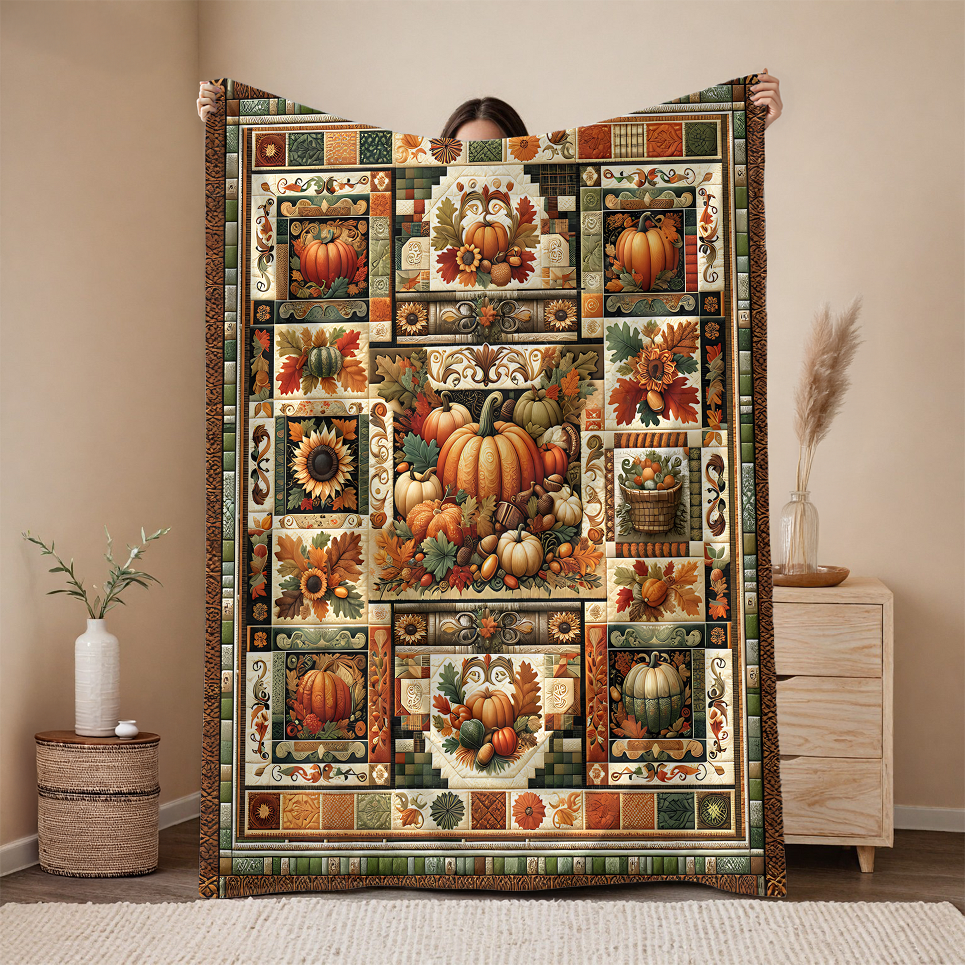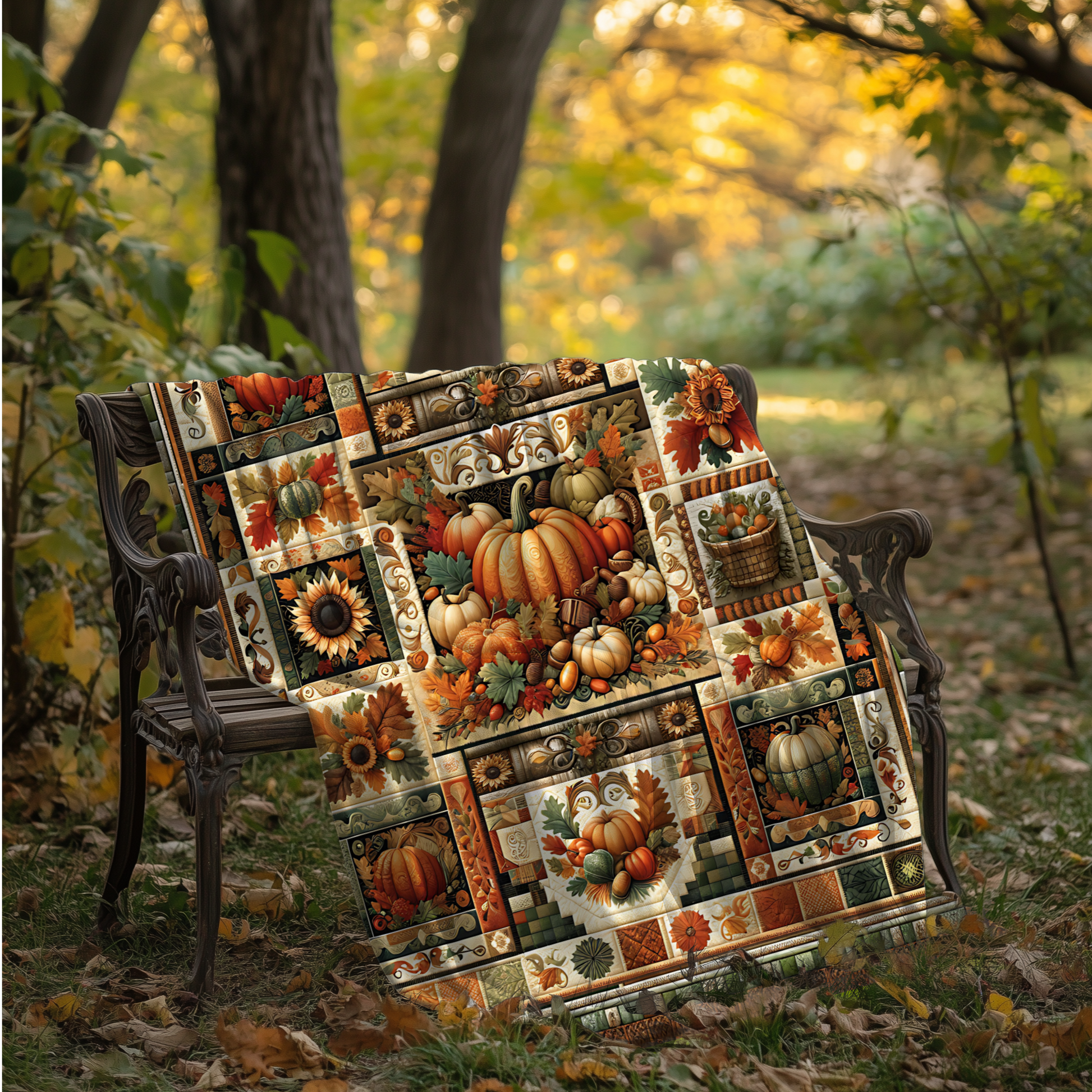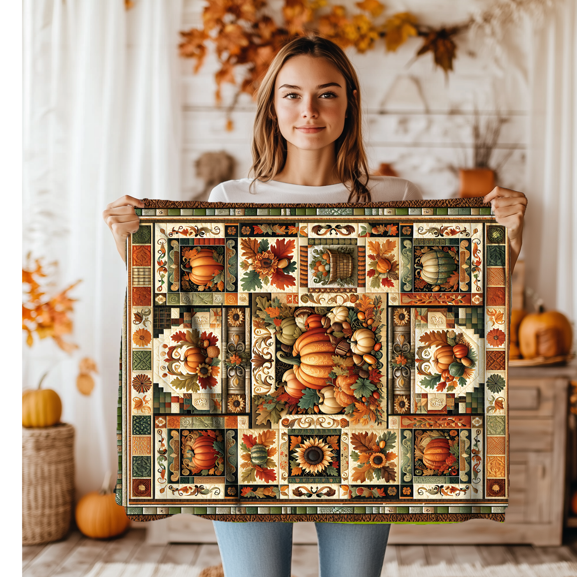 Harvest Patchwork Blanket Gift for Mom, Cozy Autumn Throw with Pumpkins, Sunflowers & Fall Leaves, Rustic Farmhouse Quilt Look, Host Gift