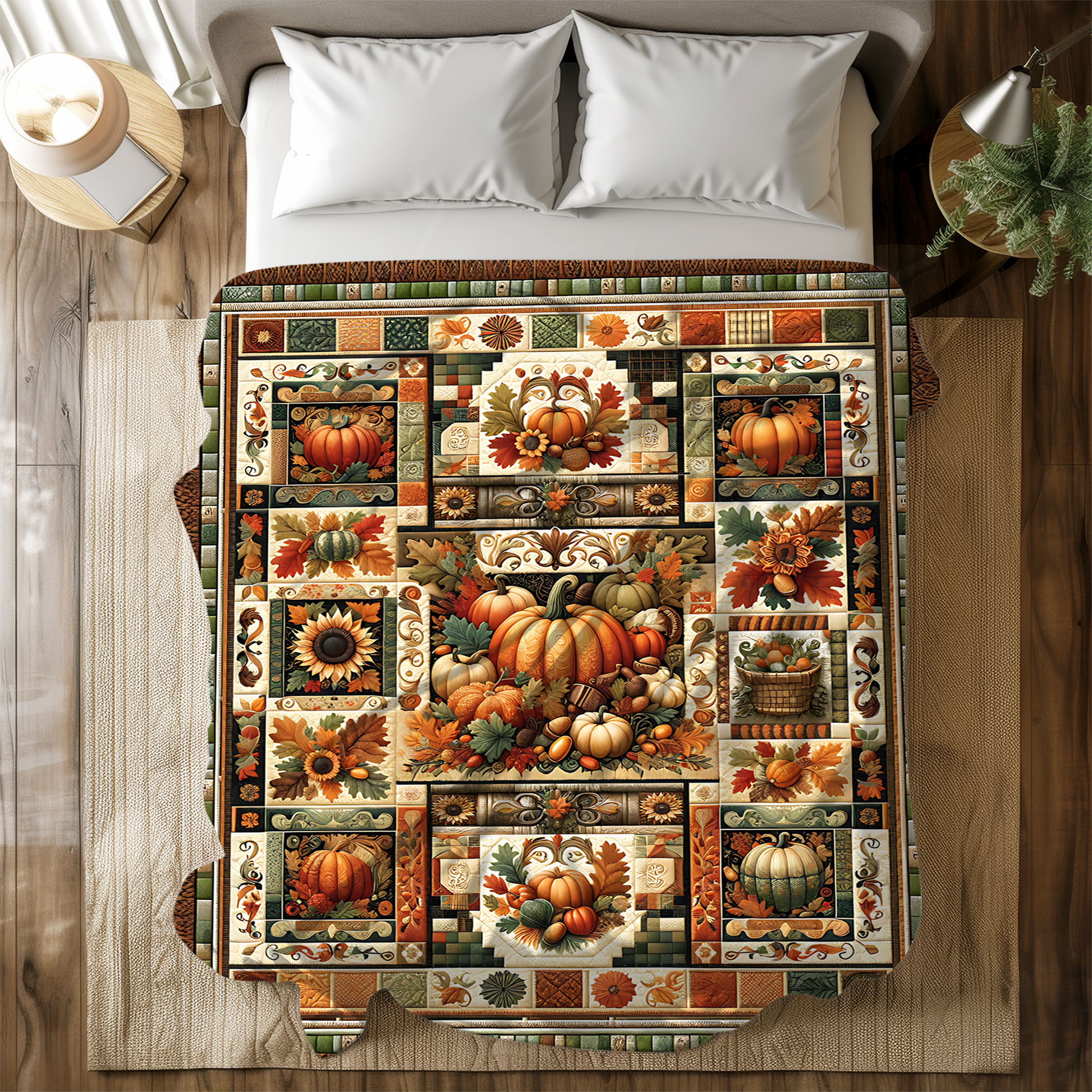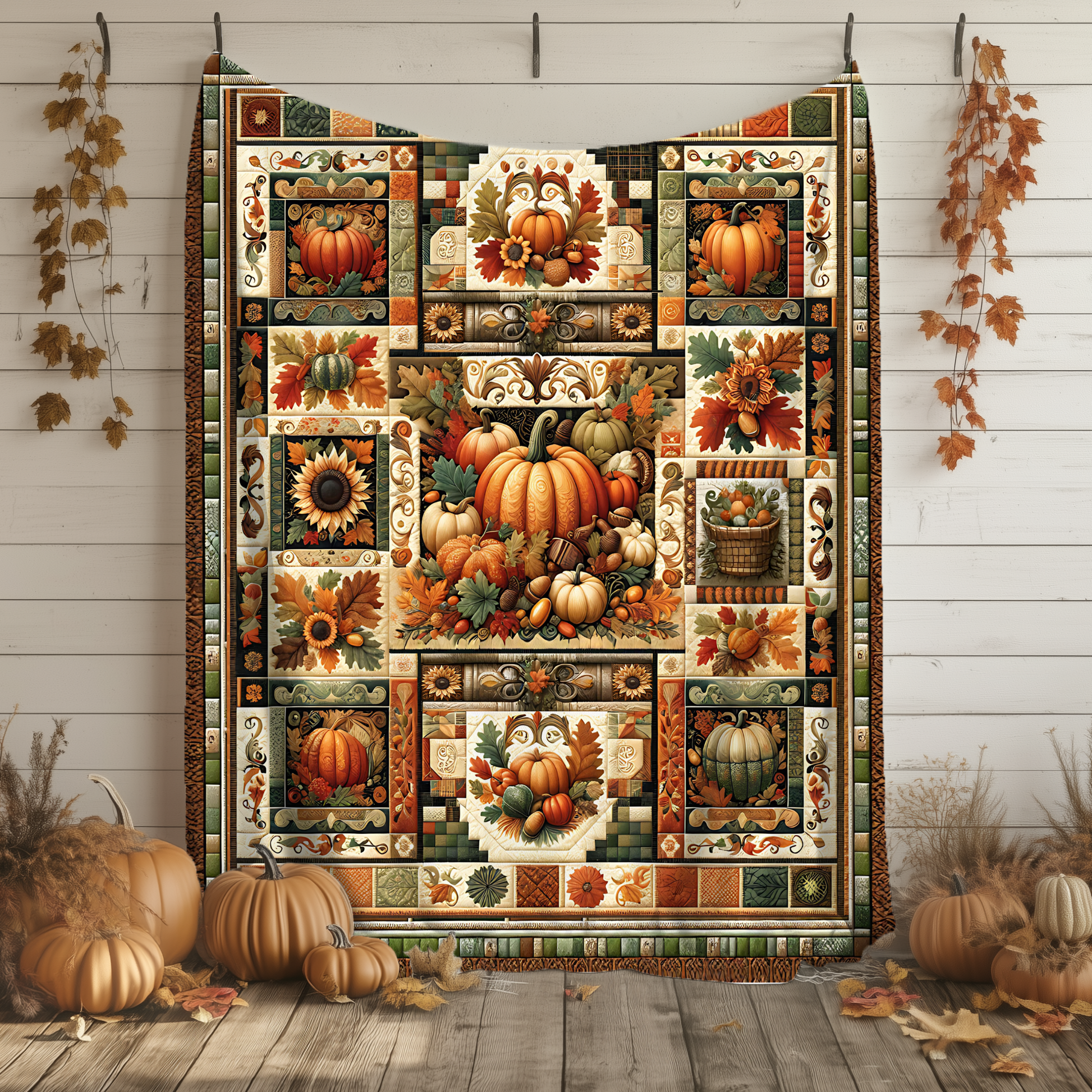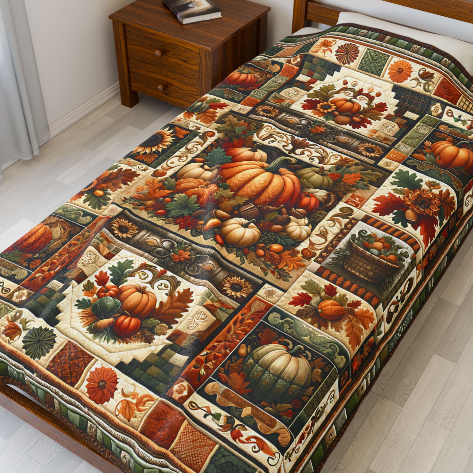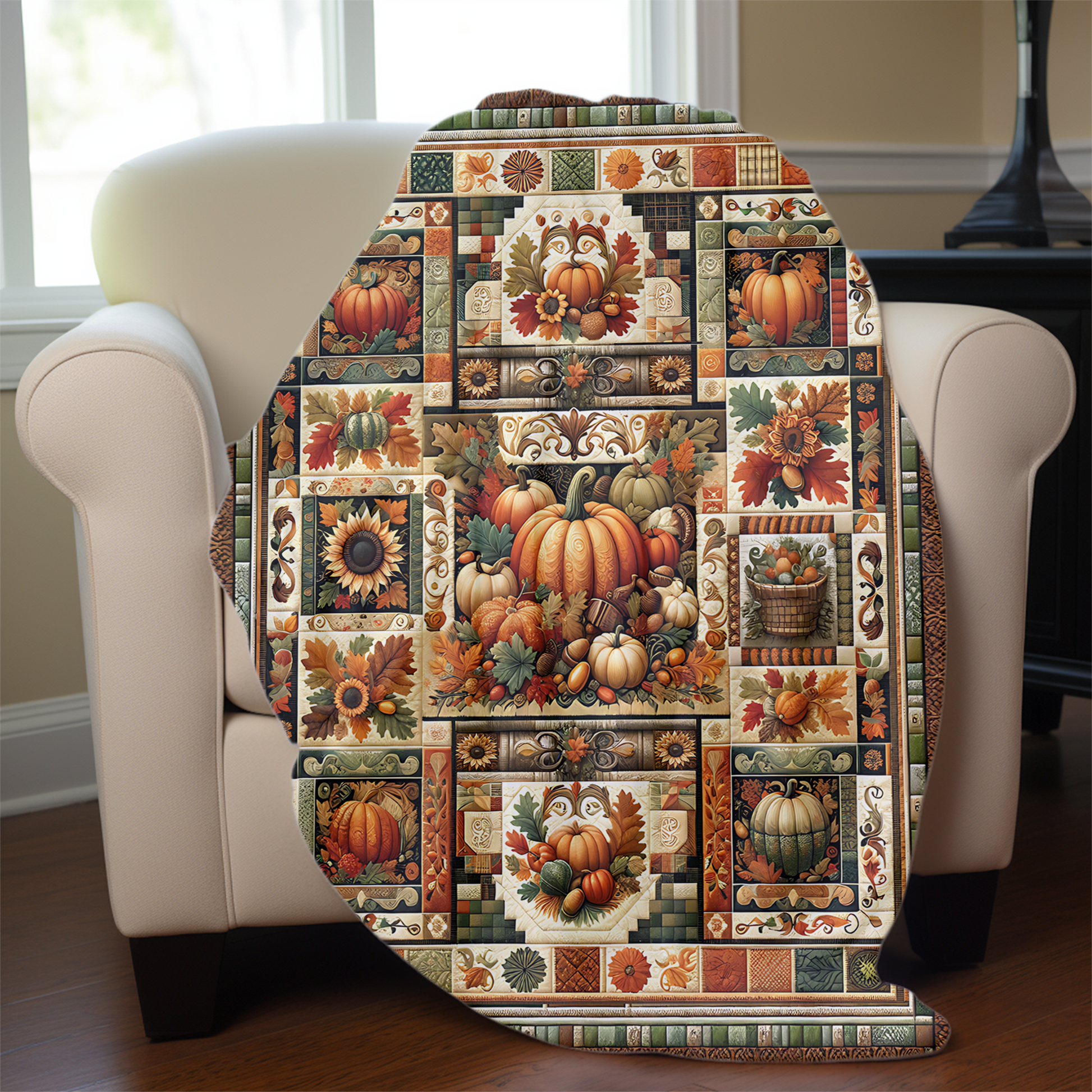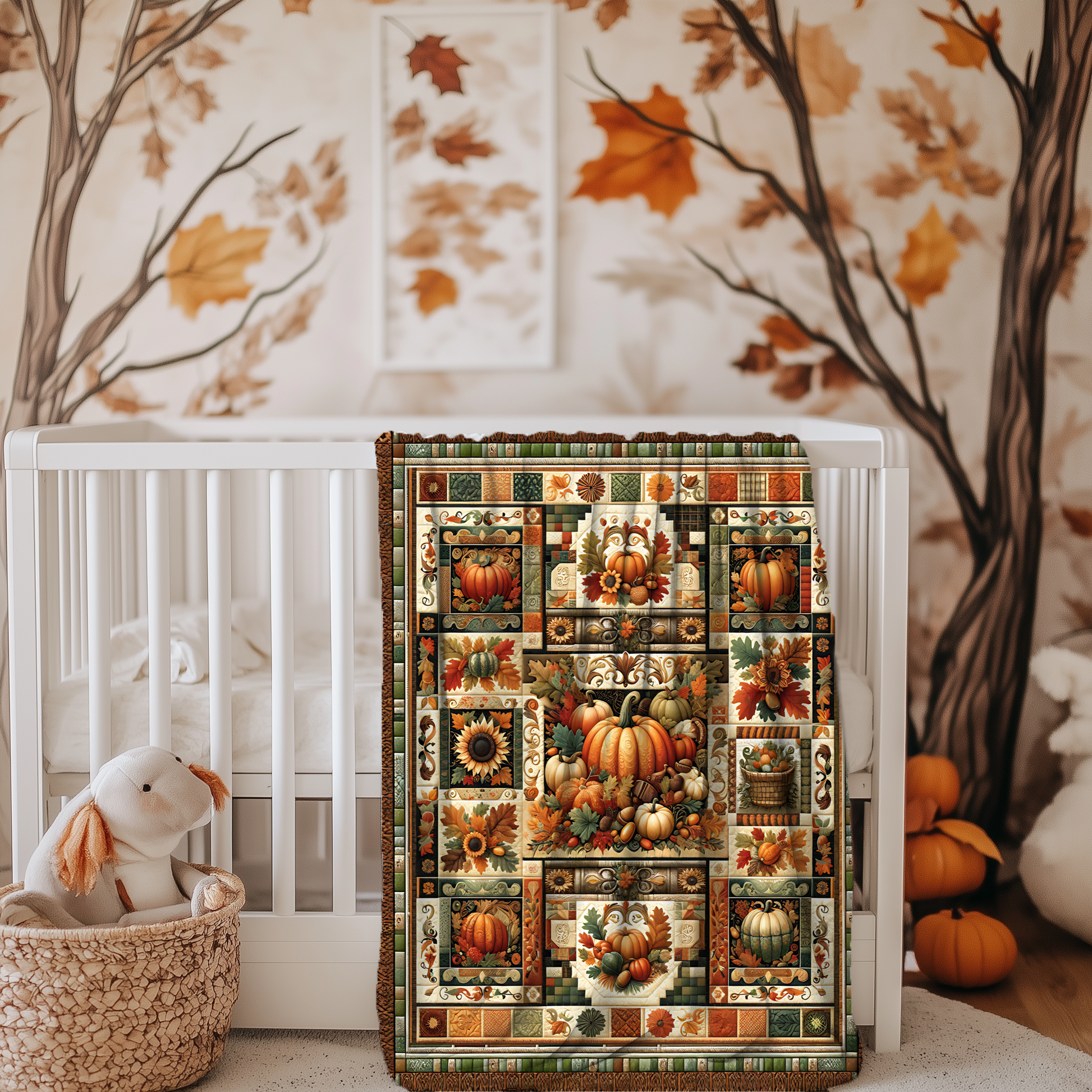 Harvest Patchwork Blanket Gift for Mom, Cozy Autumn Throw with Pumpkins, Sunflowers & Fall Leaves, Rustic Farmhouse Quilt Look, Host Gift