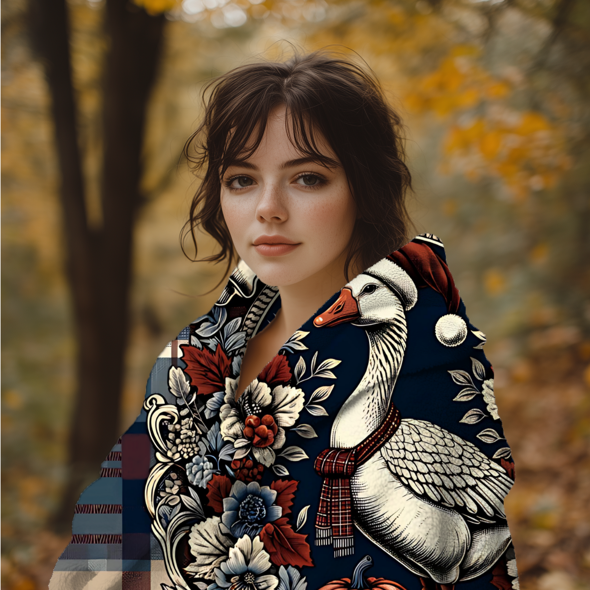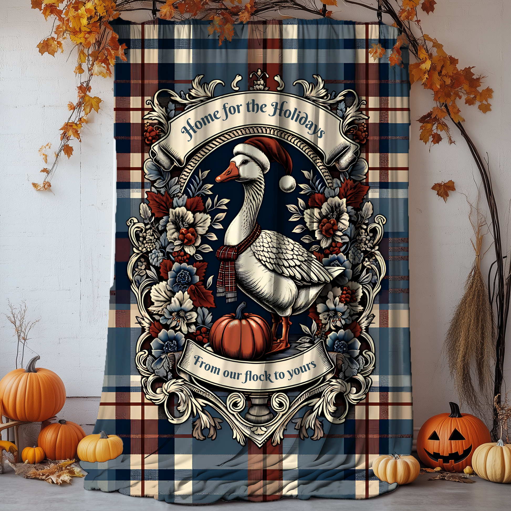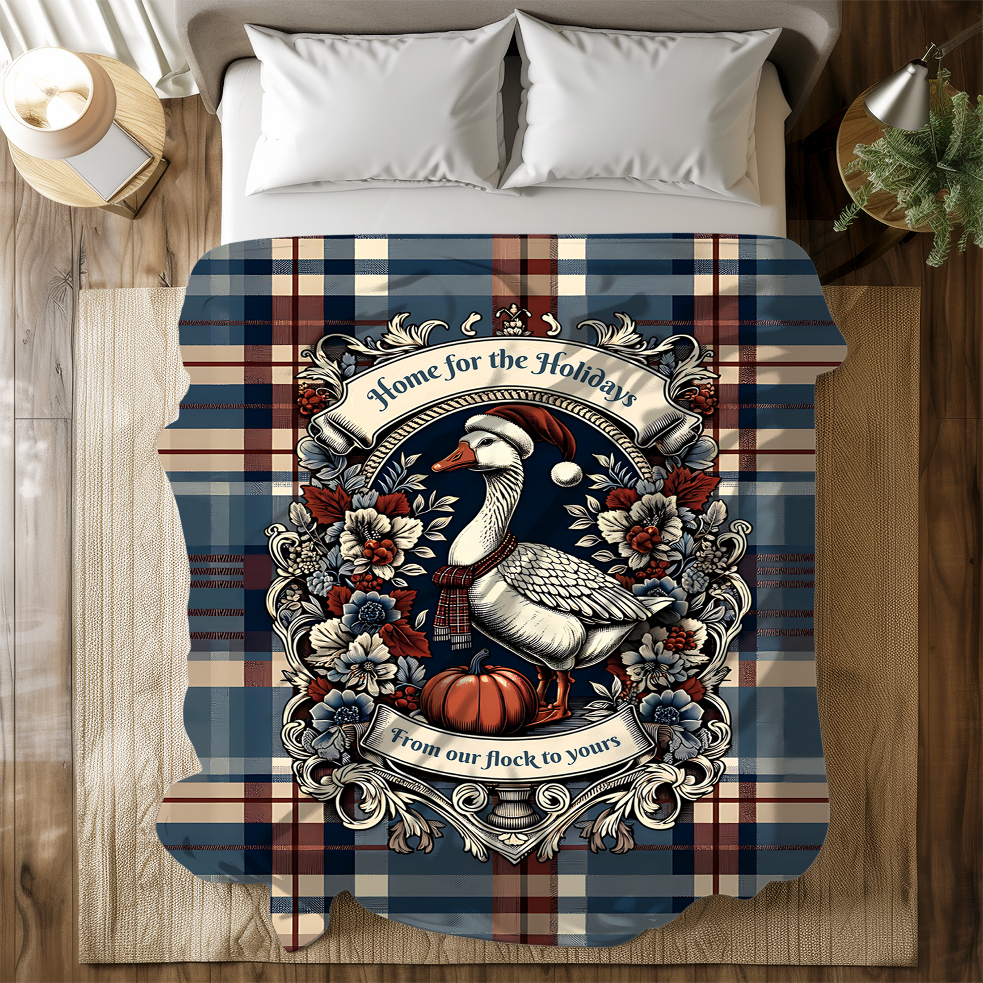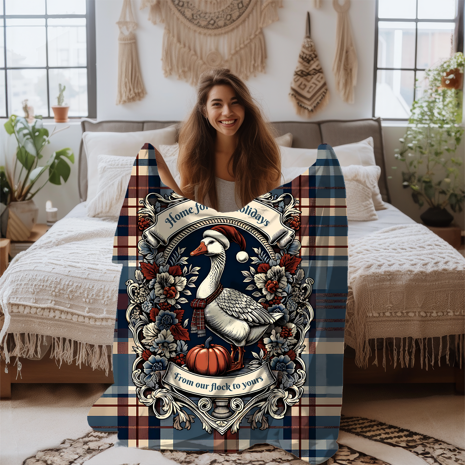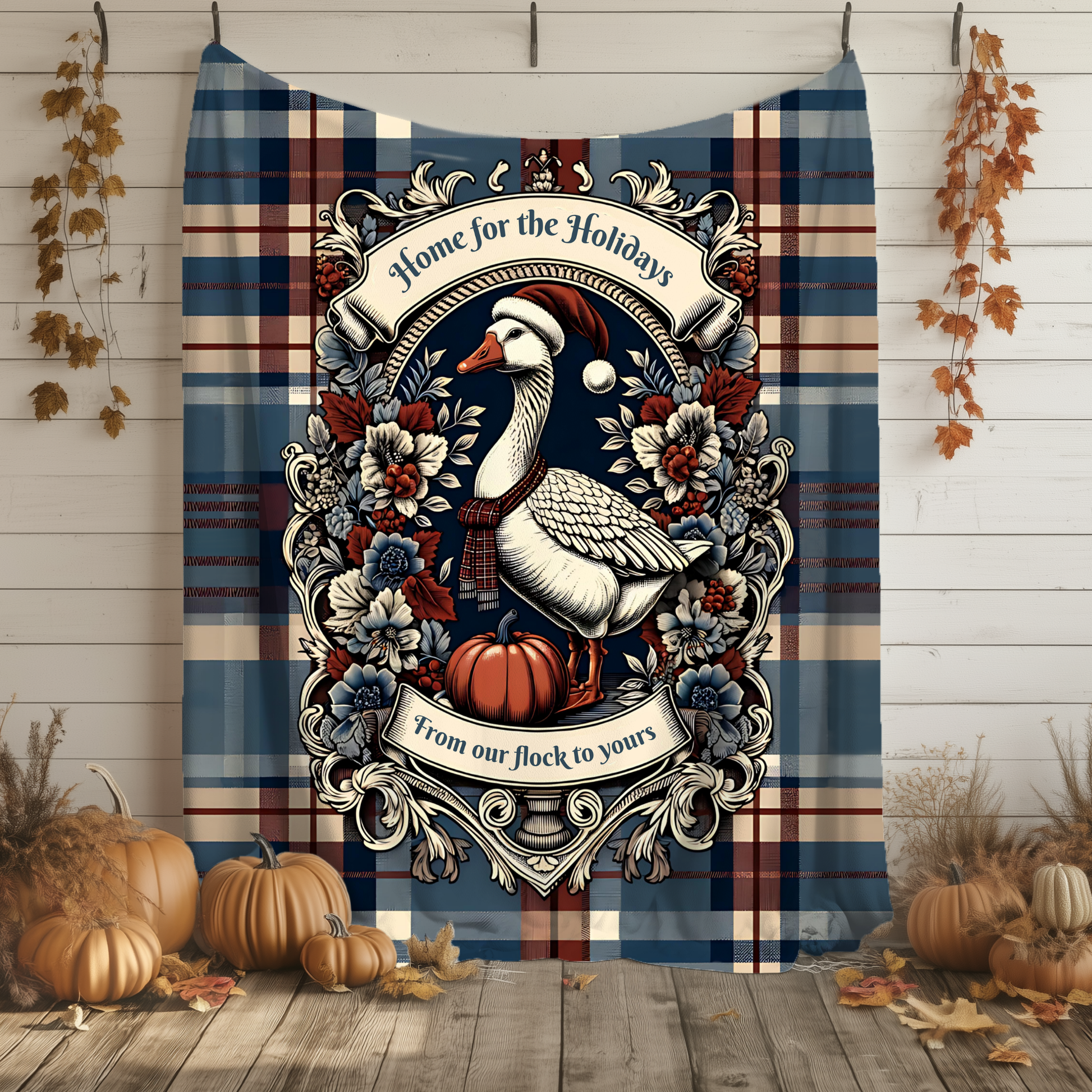 Wrap yourself in warmth and charm this holiday season with our Home for the Holidays Goose Blanket. Featuring a whimsical goose in a Santa hat, surrounded by festive florals, a pumpkin, and rustic plaid, this design blends farmhouse style with cozy nostalgia. The heartfelt message, “From Our Flock to Yours”, makes it a perfect gift for family, friends, or your own home.O