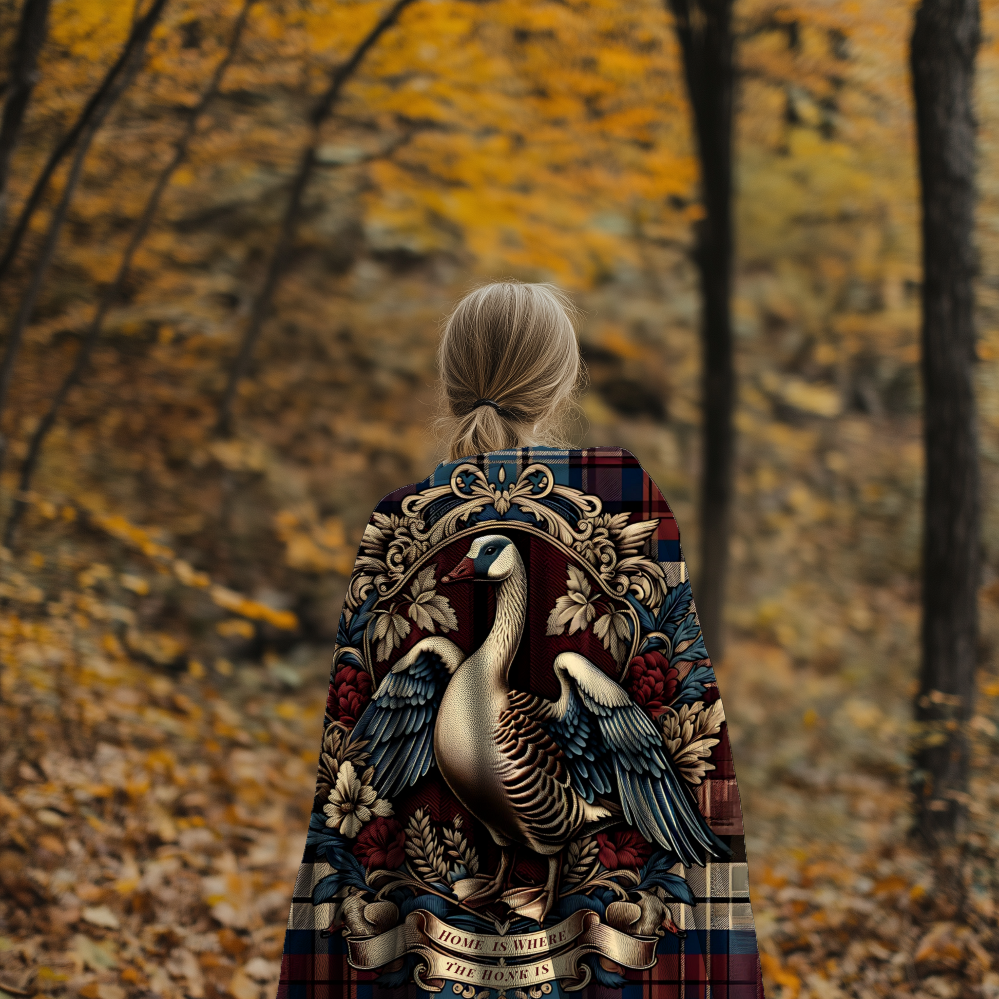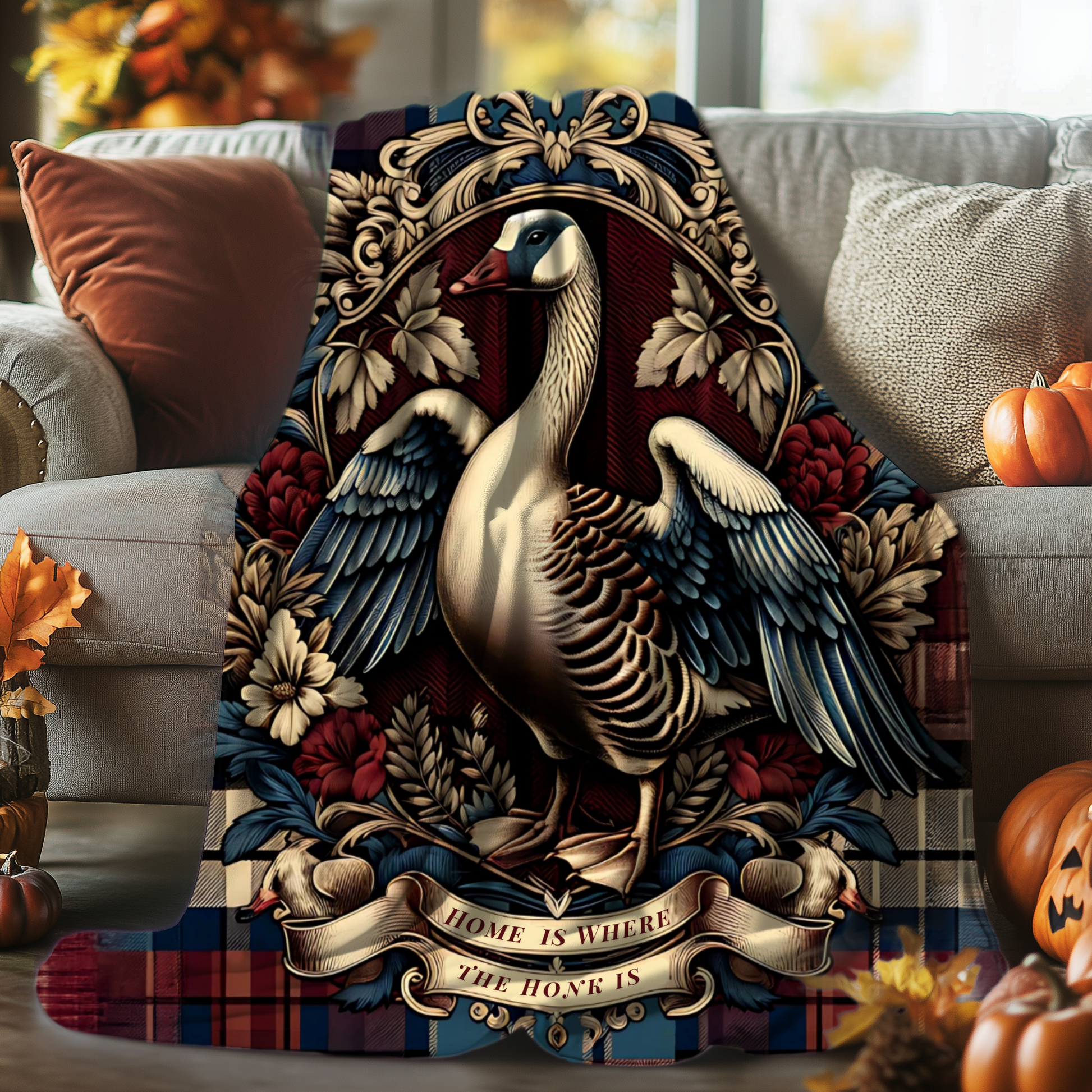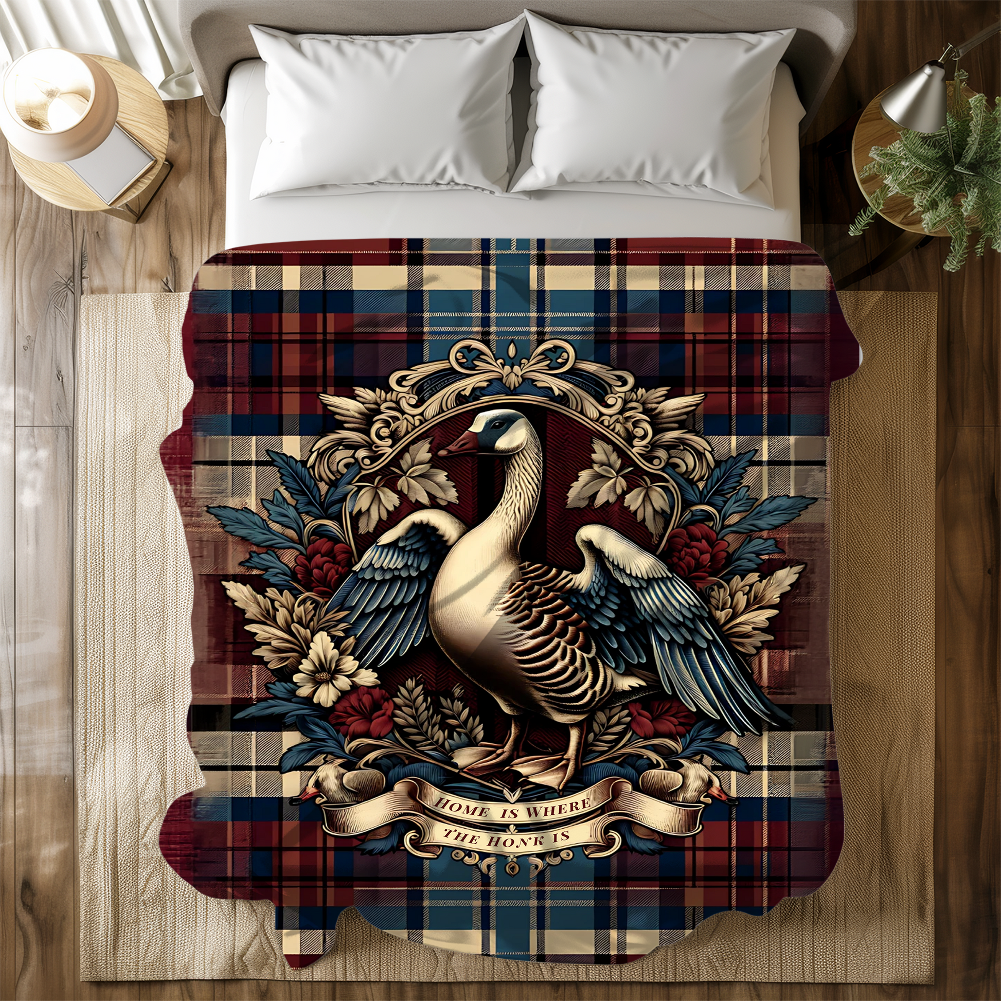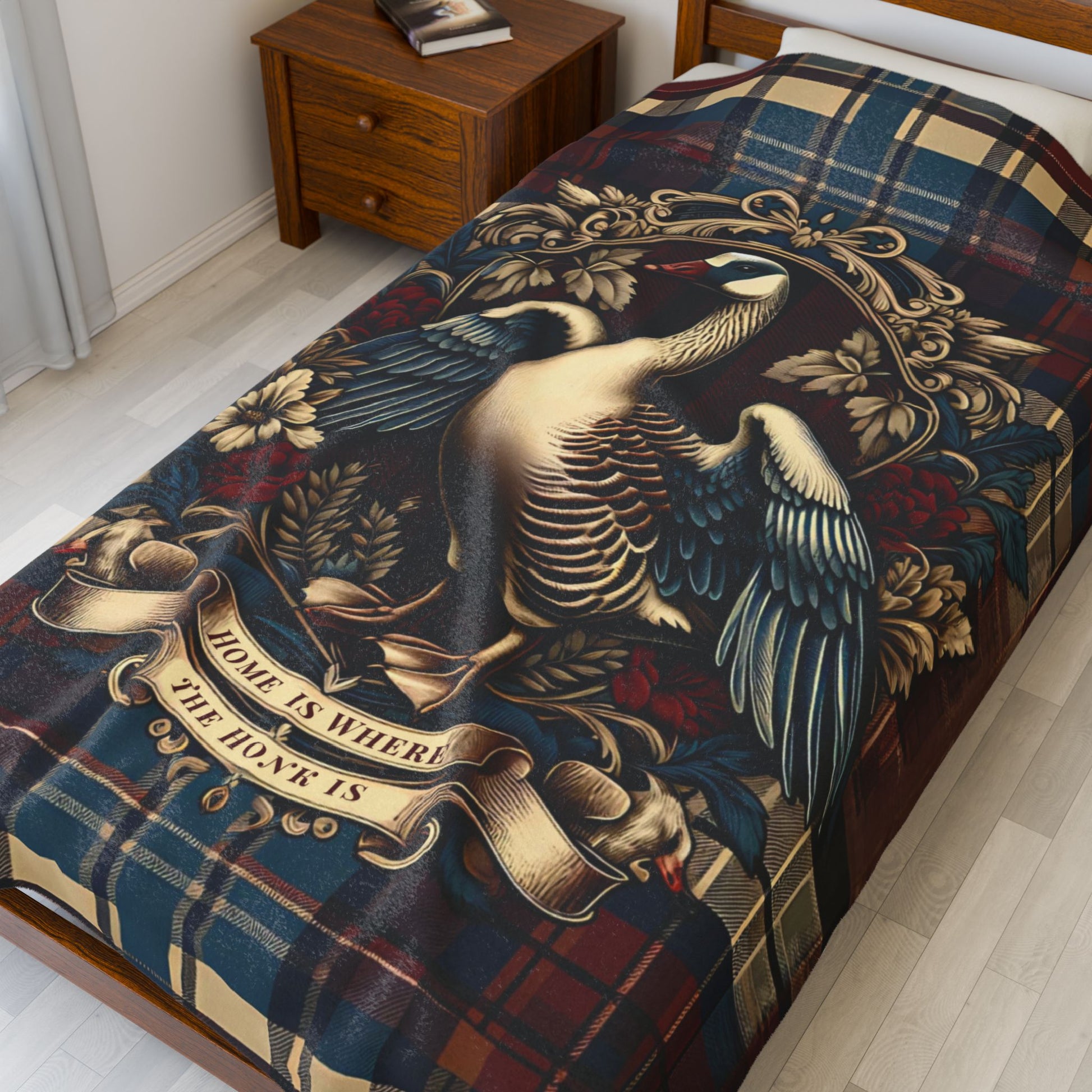 Bring a smile (and a honk!) to your home with this charming Home is Where the Honk Is Blanket, featuring a rustic plaid backdrop, vintage-inspired goose illustration, and playful ribbon text. Cozy, quirky, and full of personality, this soft velveteen blanket makes a heartfelt and hilarious addition to any space.