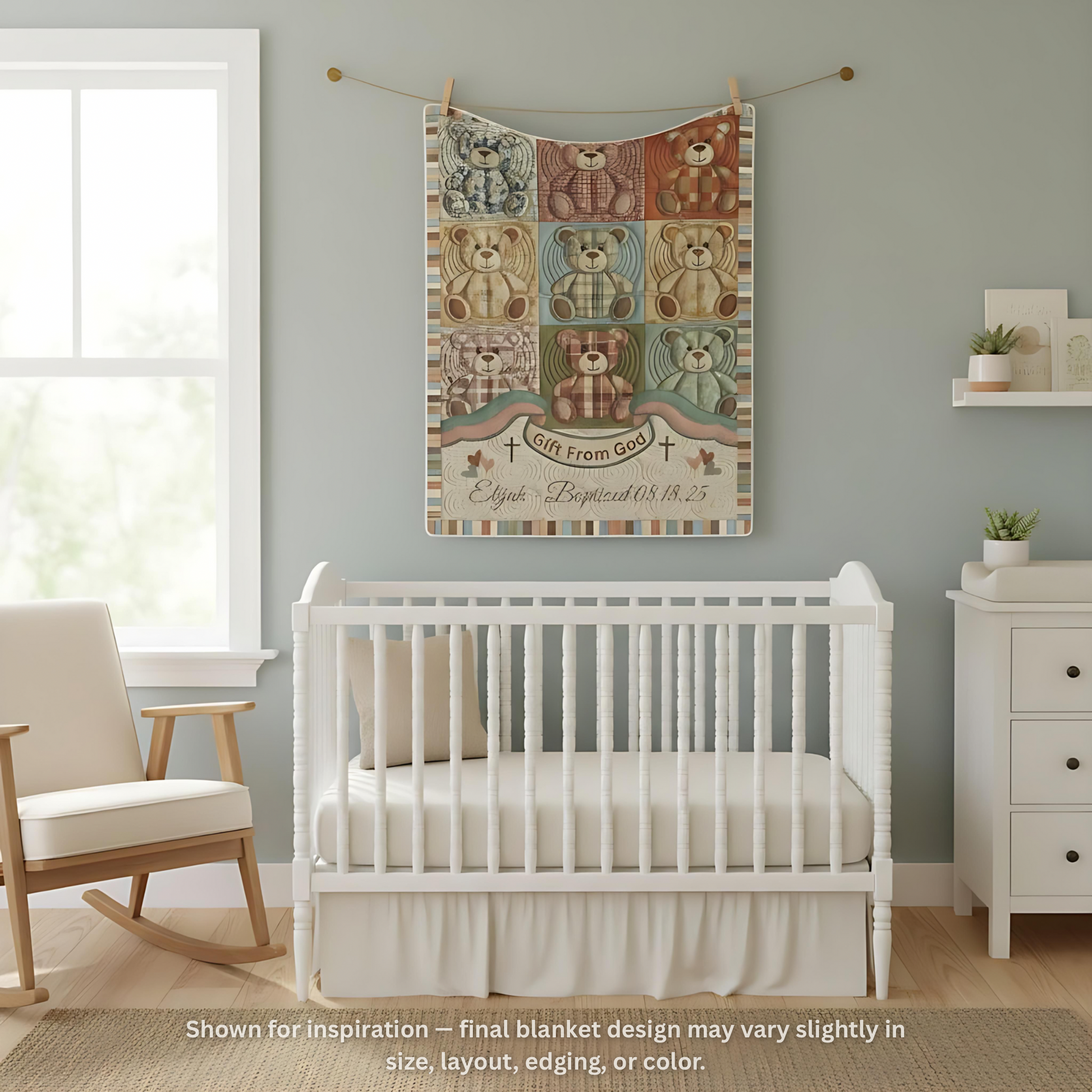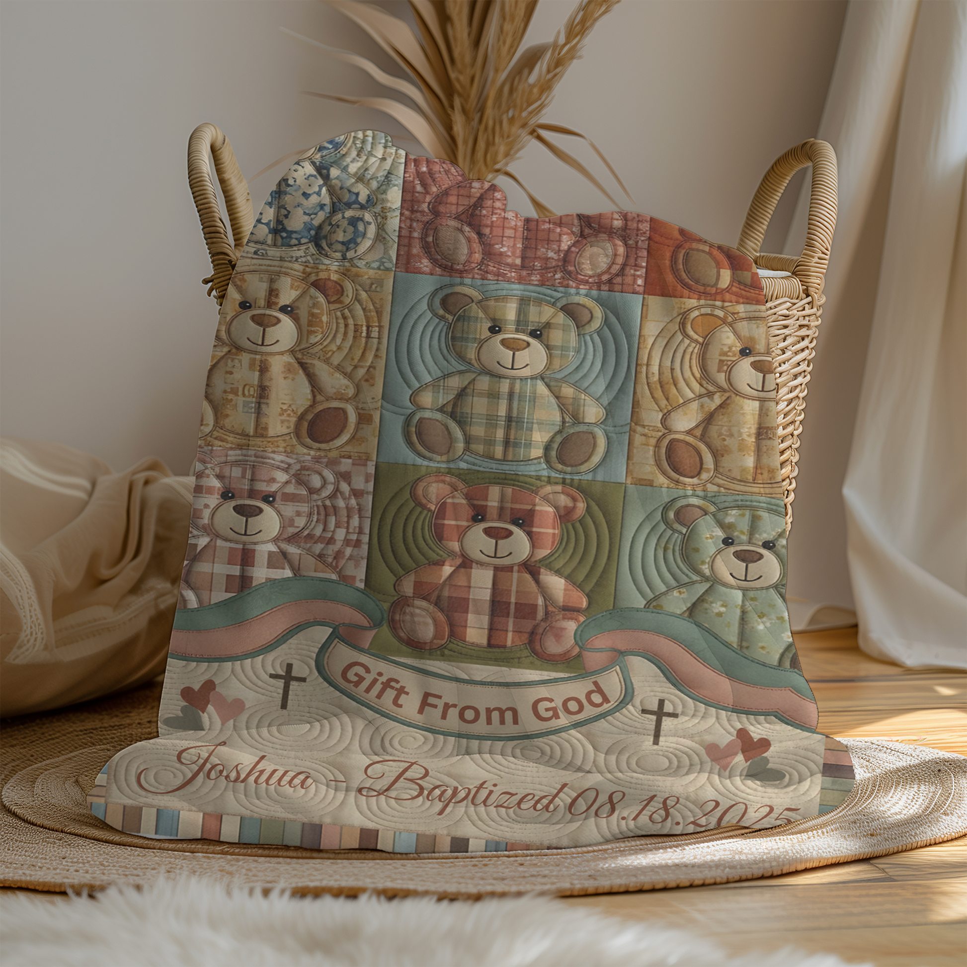 Wrap your little one in a keepsake of faith and love. This soft, minky-fleece blanket features a timeless patchwork teddy bear design