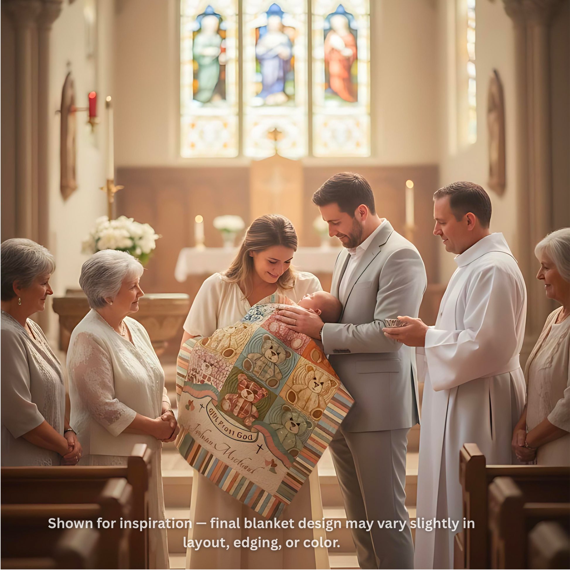 nursery or memory chest — a keepsake to treasure for years. Each blanket is personalized with your child’s name, baptism date, or