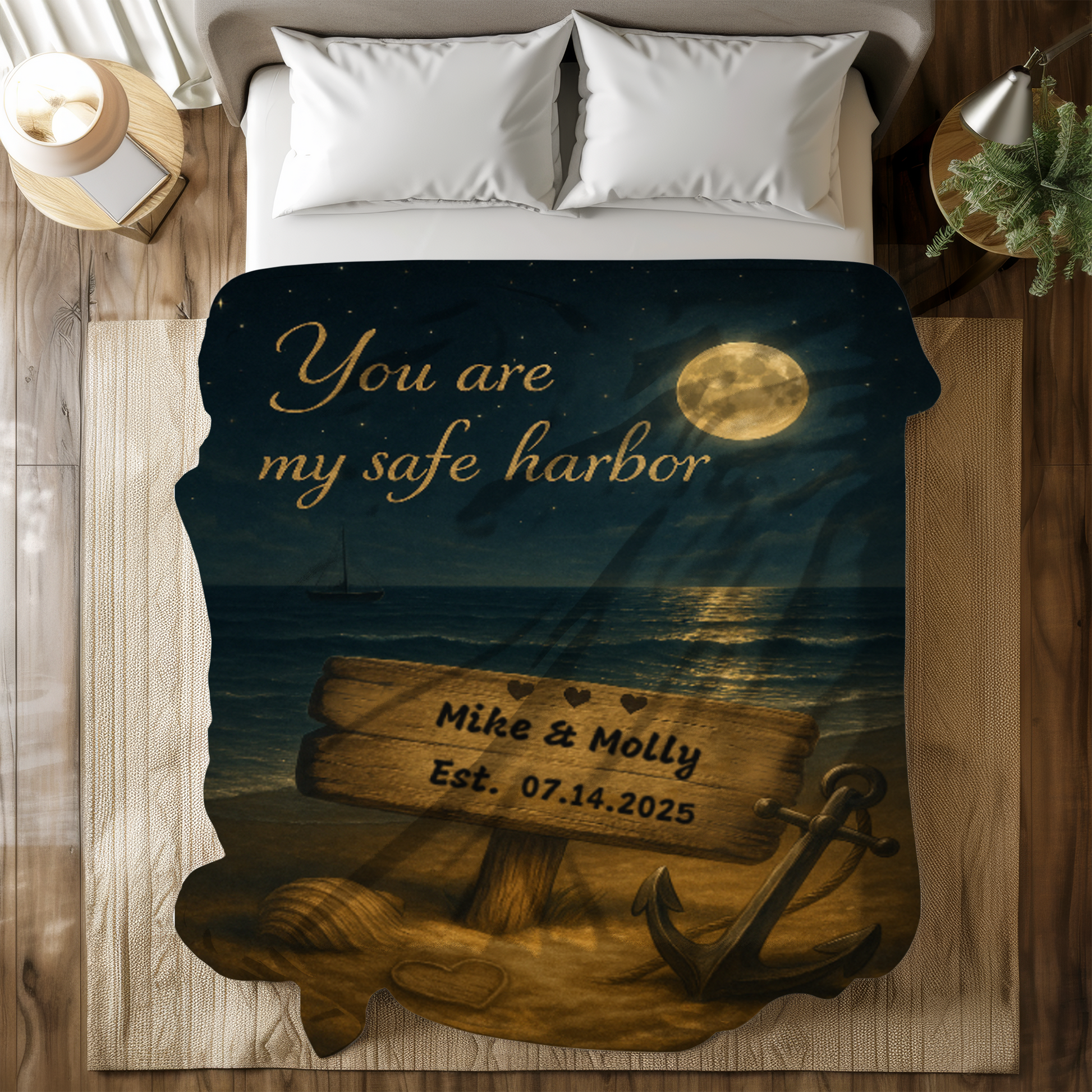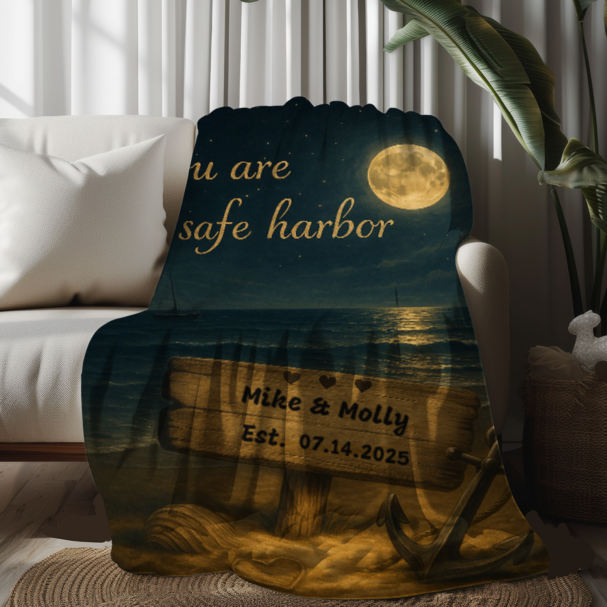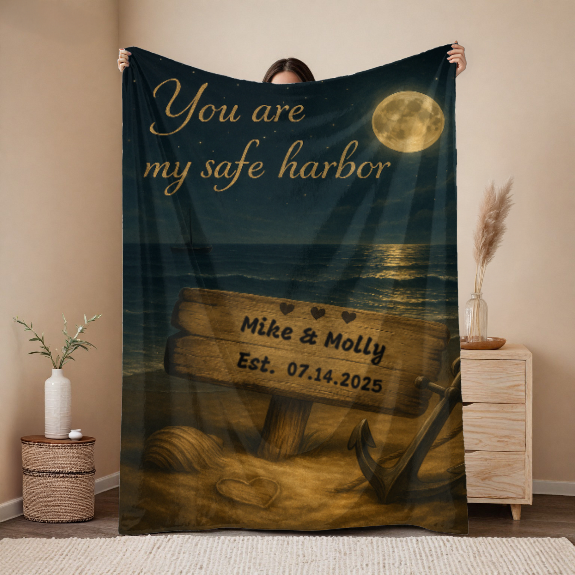 This ultra-soft velveteen blanket features a moonlit ocean scene with an anchor in the sand and names carved into driftwood, symbolizing stability, love, and devotion. The golden words “You are my safe harbor” are illuminated by the full moon, creating a romantic, calming tribute to your forever person.