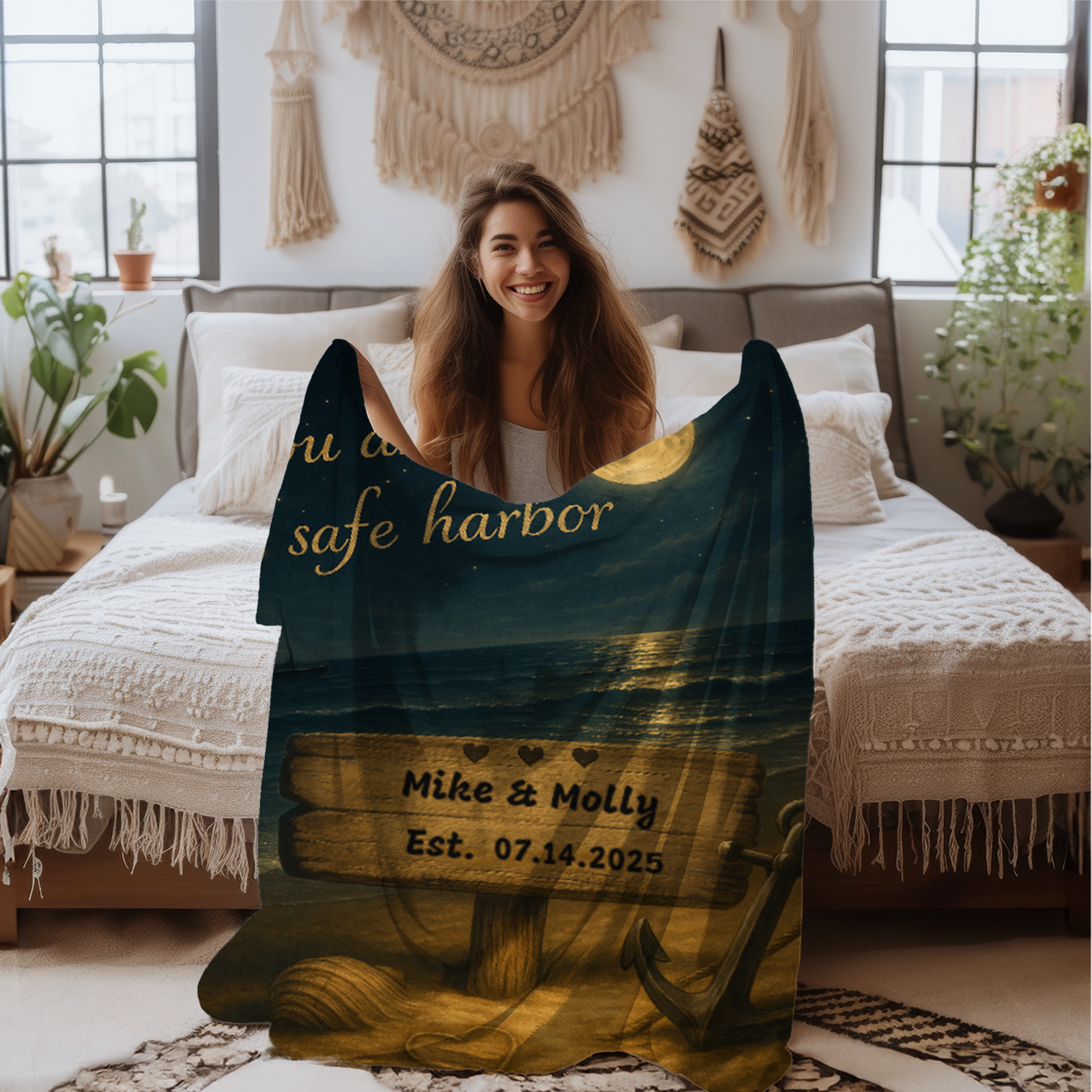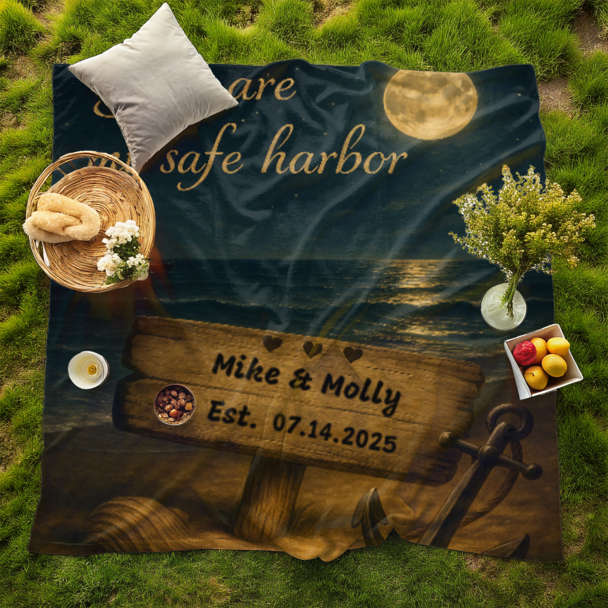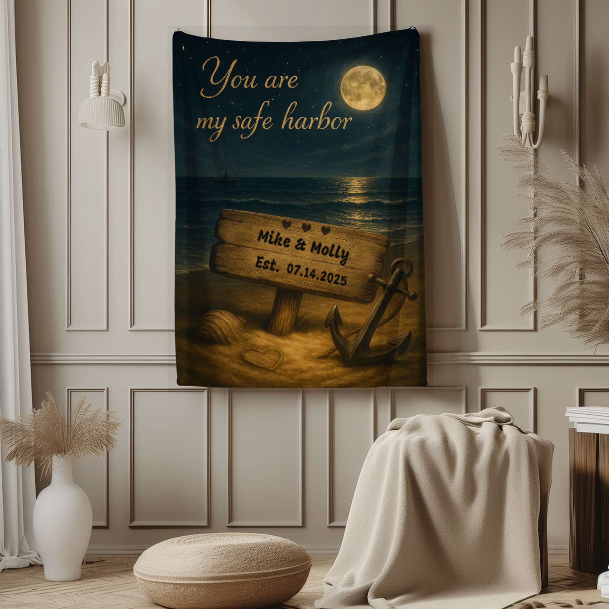This ultra-soft velveteen blanket features a moonlit ocean scene with an anchor in the sand and names carved into driftwood, symbolizing stability, love, and devotion. The golden words “You are my safe harbor” are illuminated by the full moon, creating a romantic, calming tribute to your forever person.