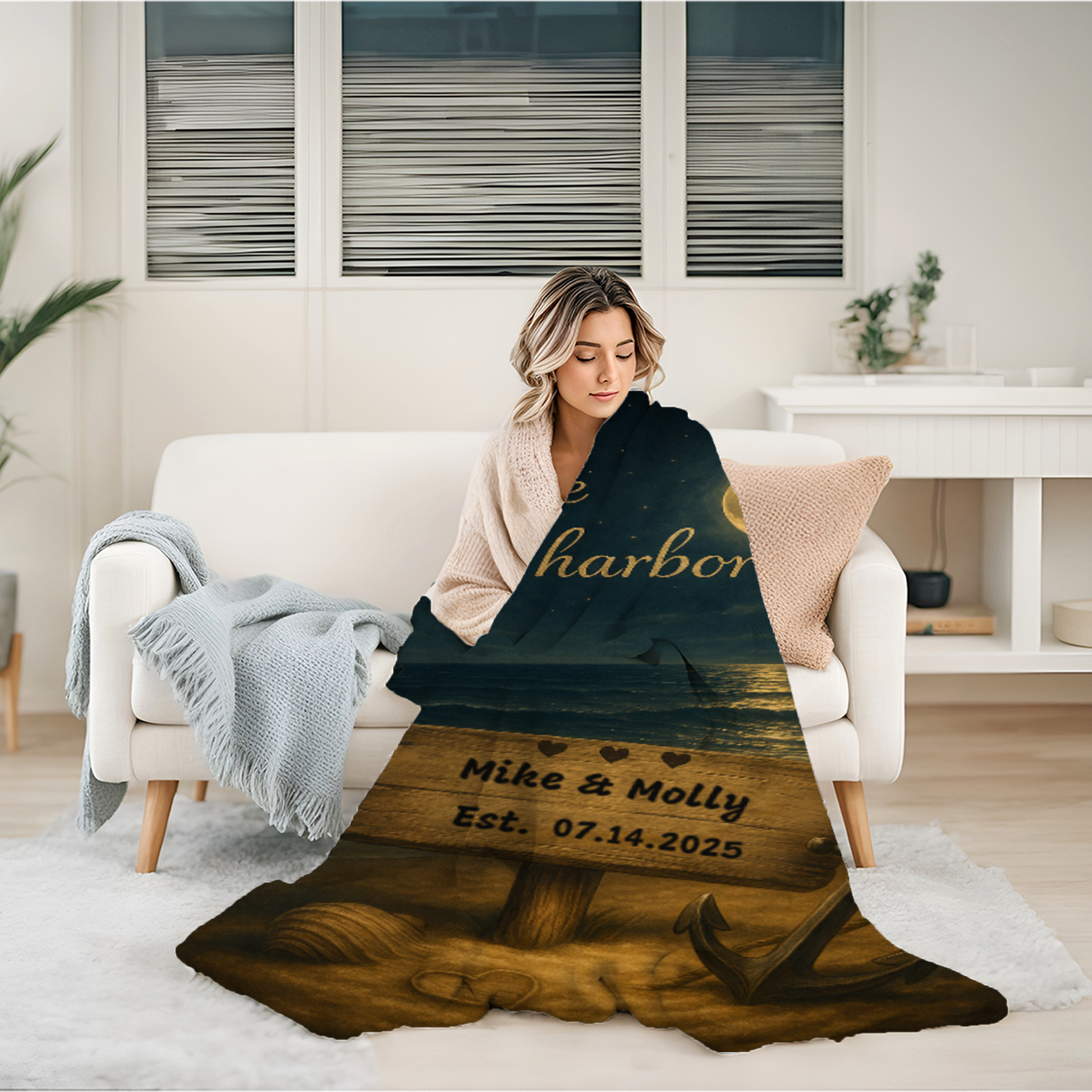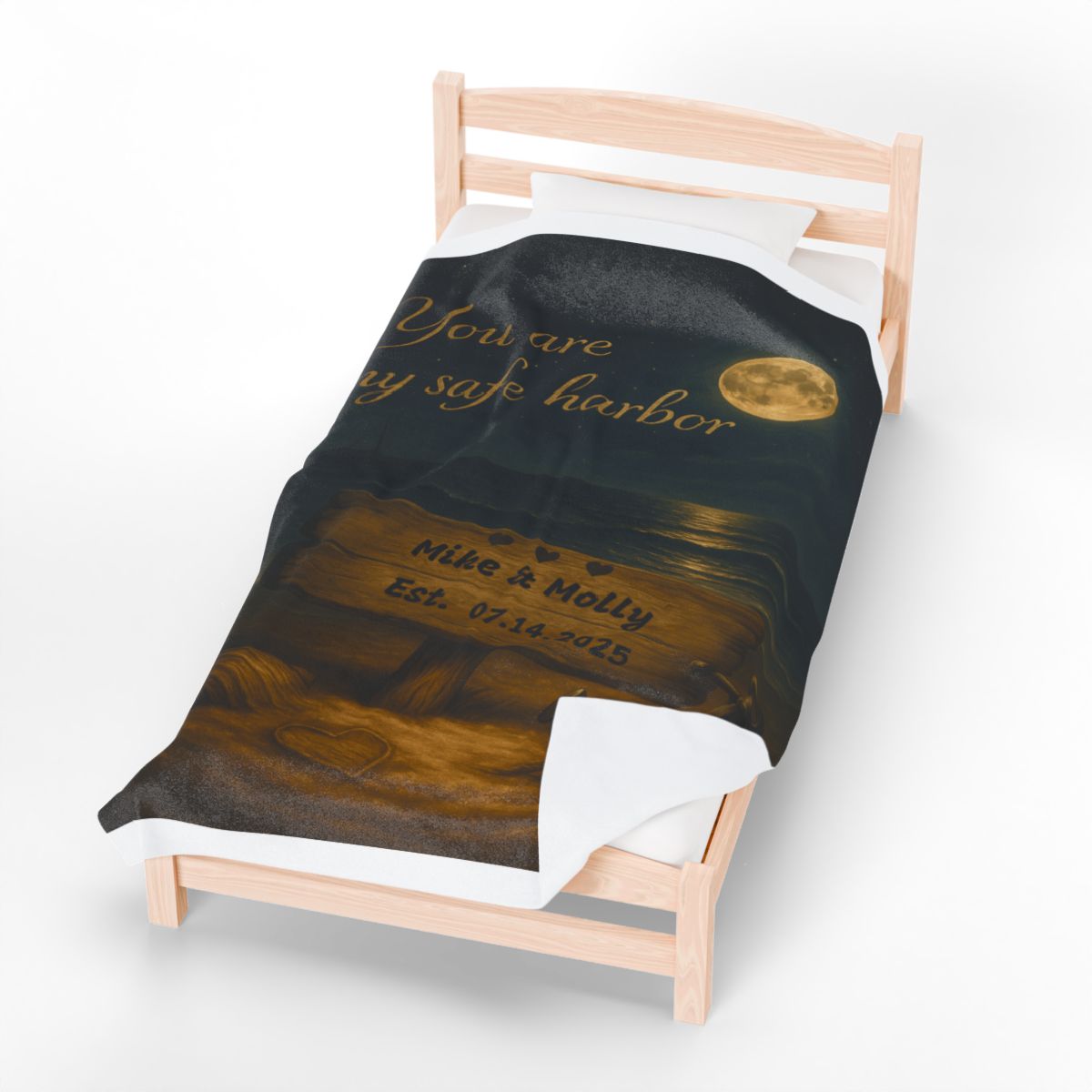 You Are My Safe Harbor Blanket – Personalized Romantic Ocean Scene Velveteen Throw