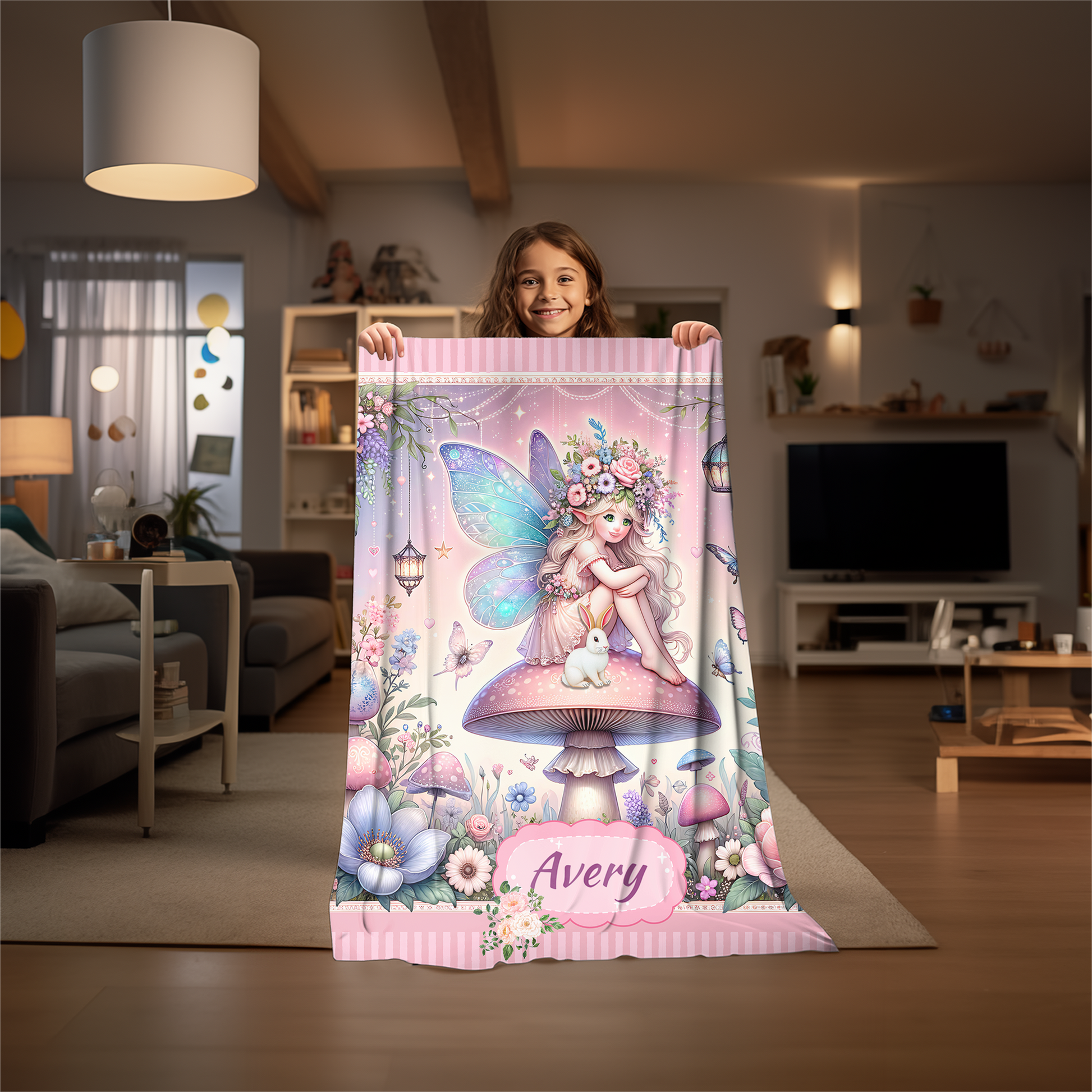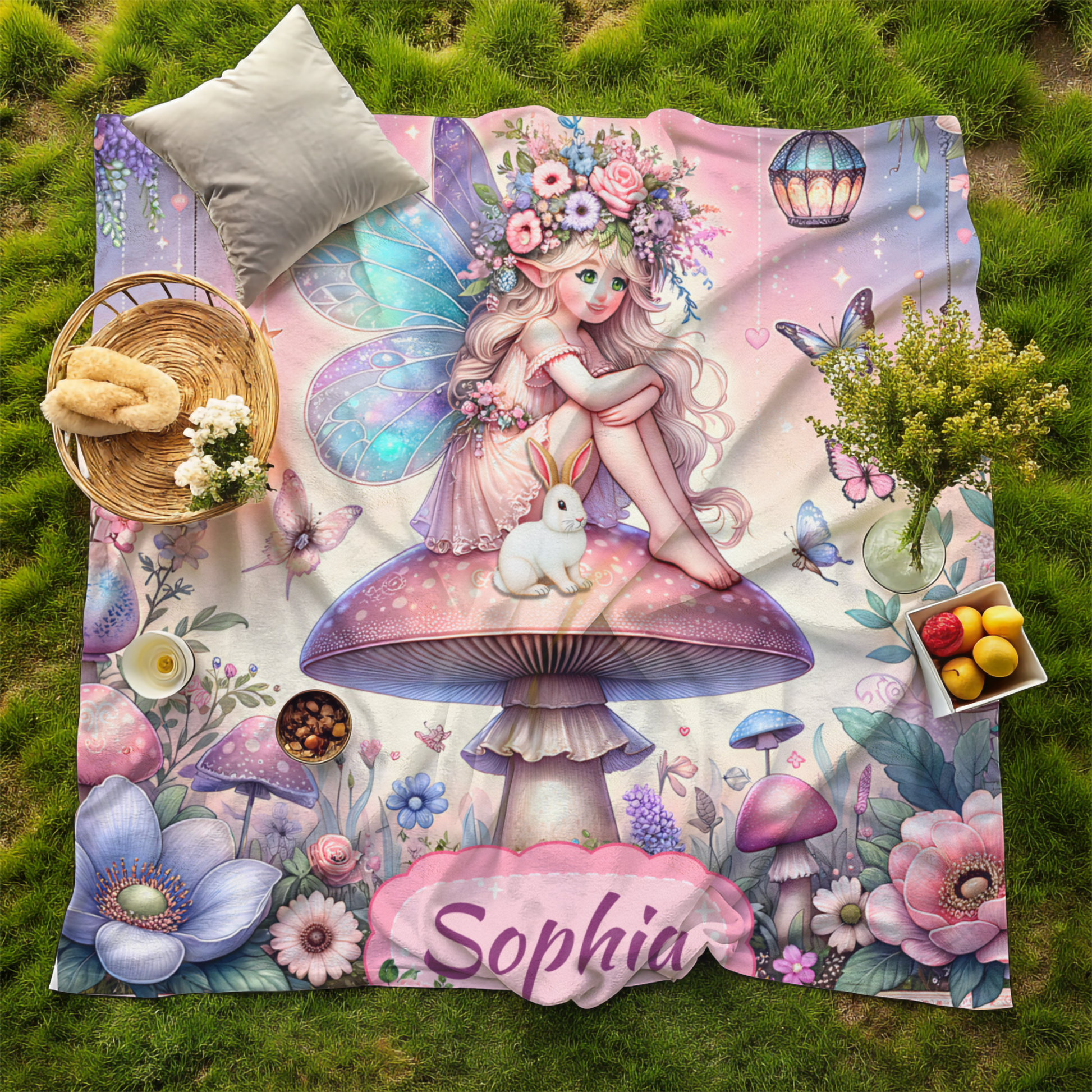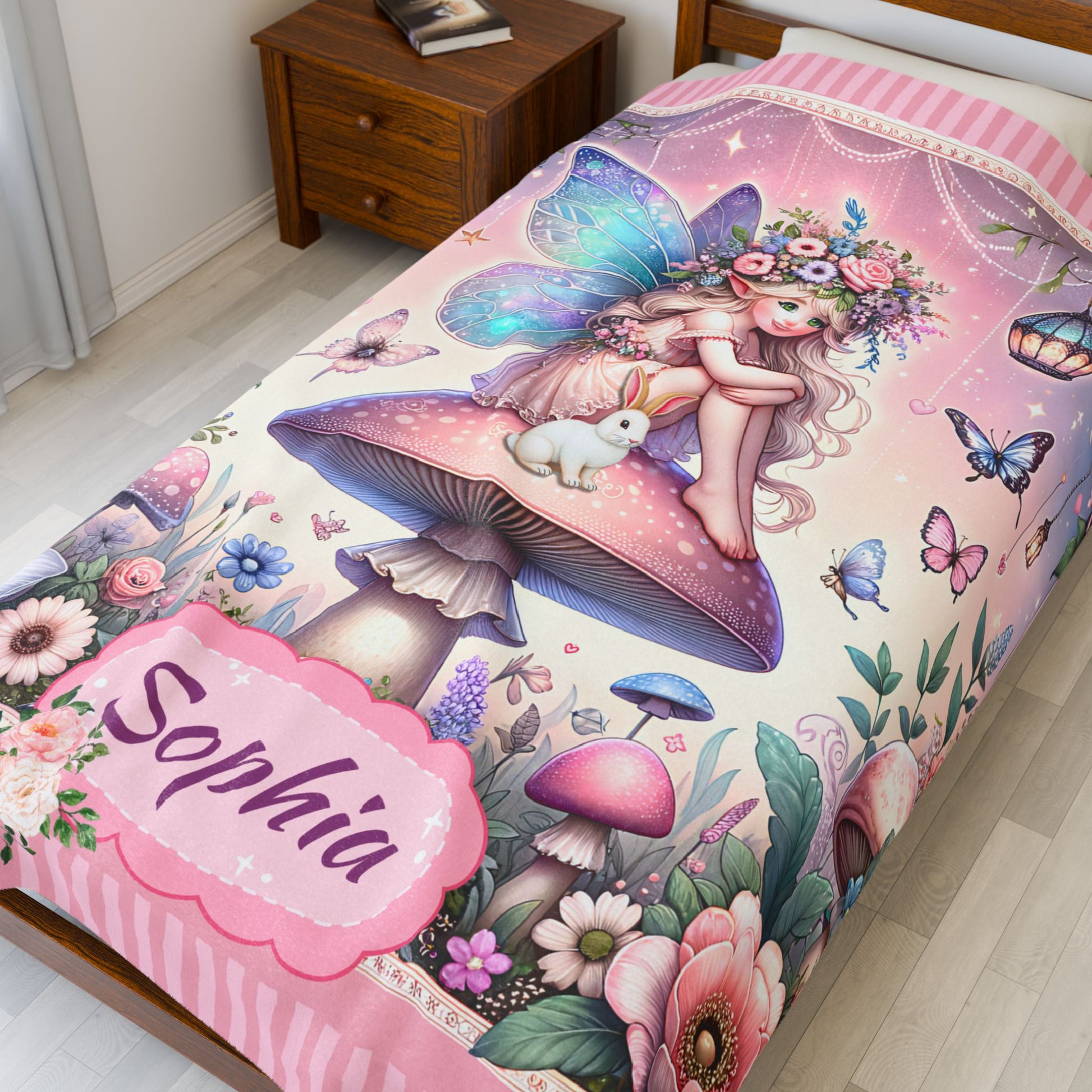Personalized Fairy Blanket for Girls – Custom Name Velveteen Throw with Bunny & Mushroom Garden, Magical Gift for Kids