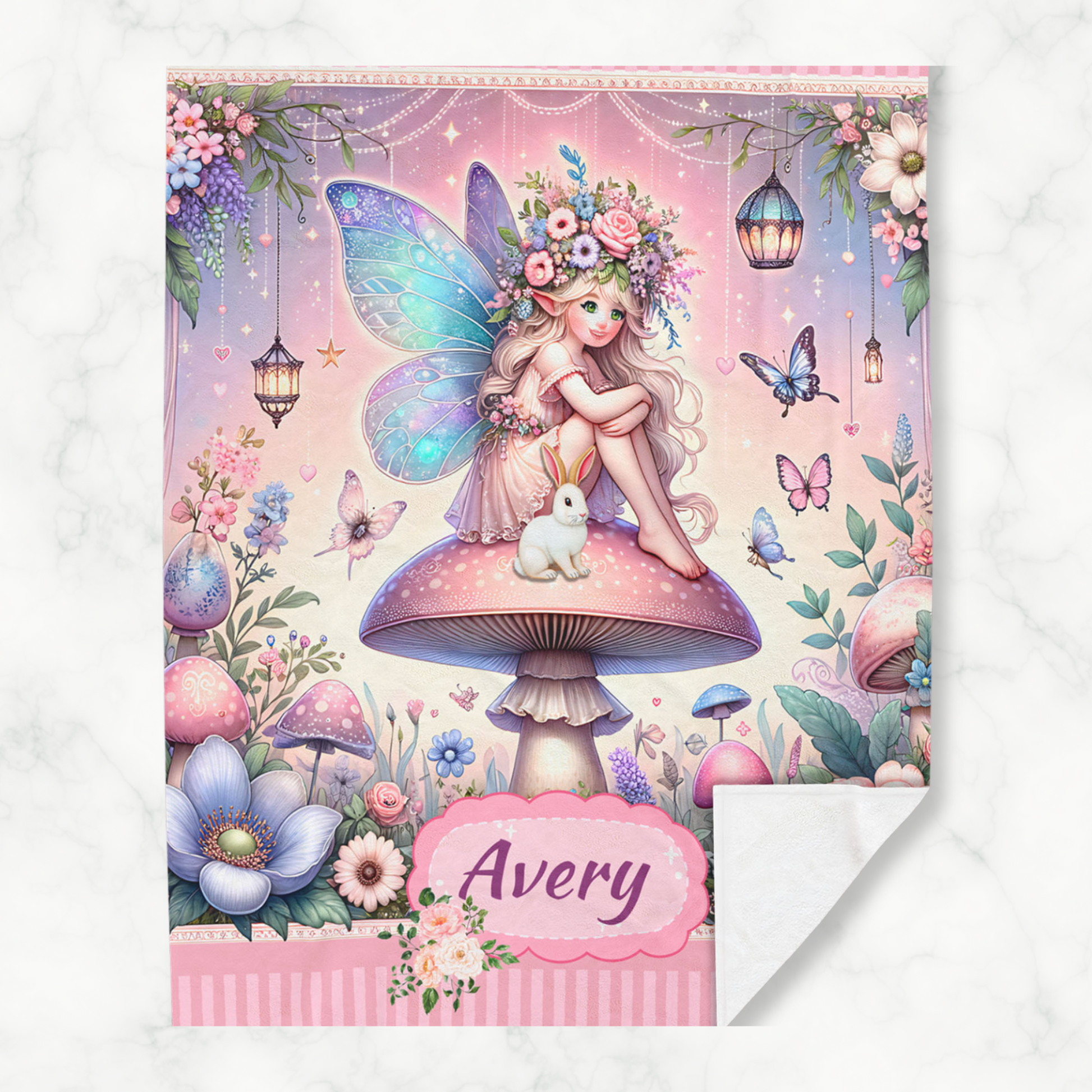 A dreamy garden filled with butterflies, blooming flowers, and a gentle bunny surrounds a beautiful fairy perched atop a mushroom. With soft velveteen fleece and your child’s name printed front and center, this blanket becomes a one-of-a-kind keepsake she’ll treasure forever.
