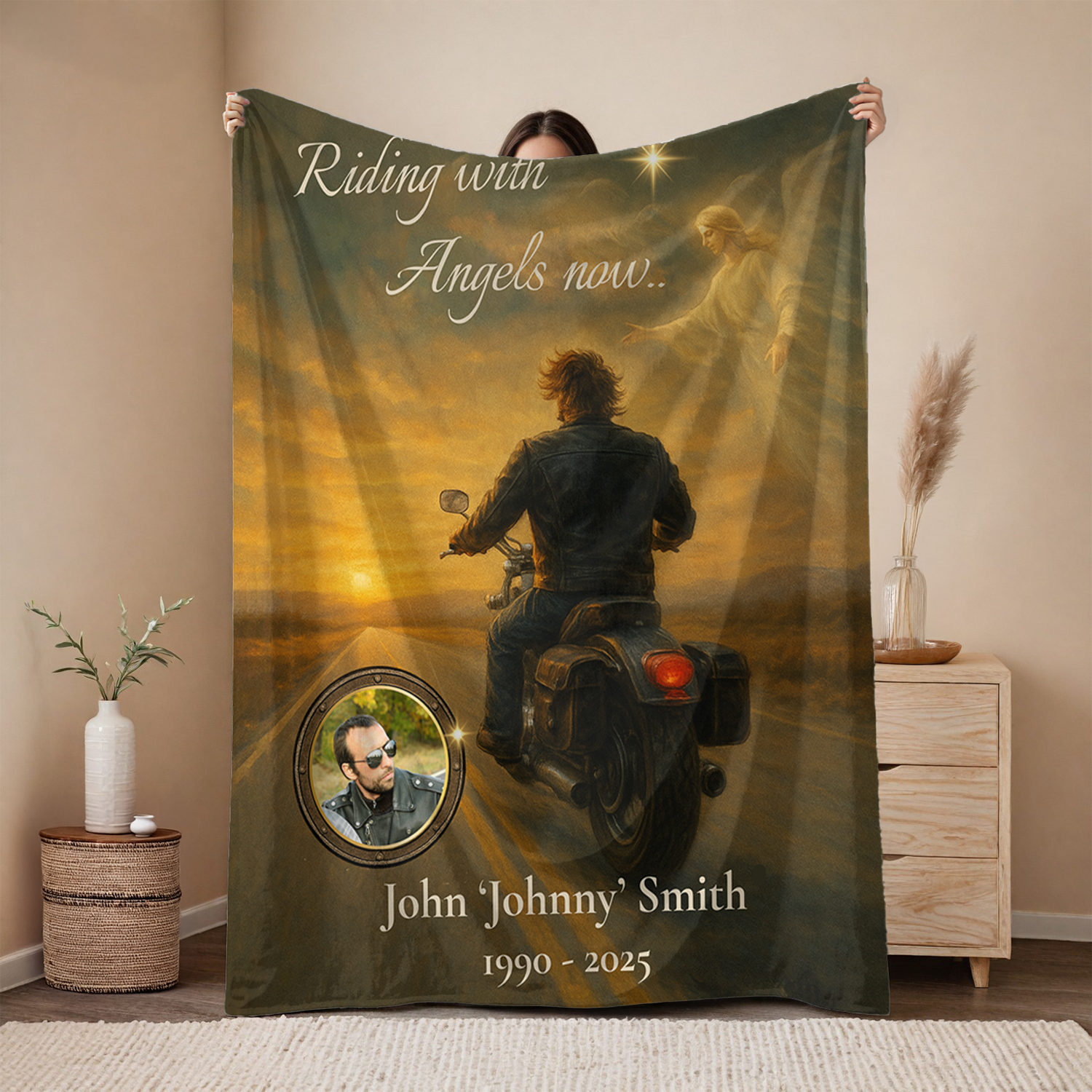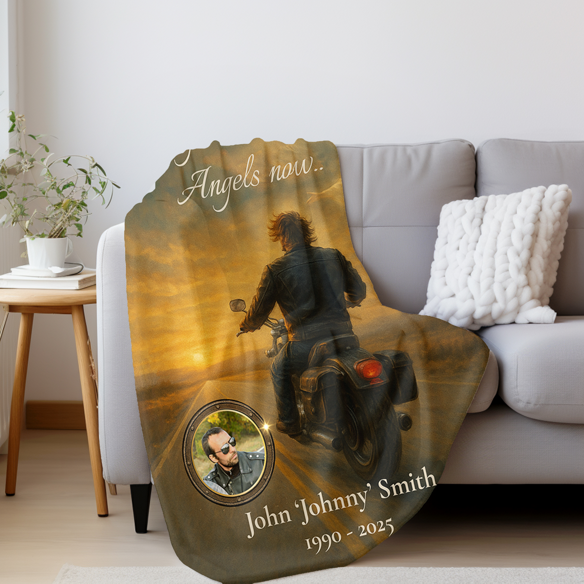 Honor a beloved biker’s journey with this powerful “Riding with Angels Now” memorial blanket. Featuring a moving image of a leather-clad rider bathed in golden light as he rides into the sunset—guided by an angel—this velveteen keepsake becomes even more meaningful with your custom photo, name, and dates.