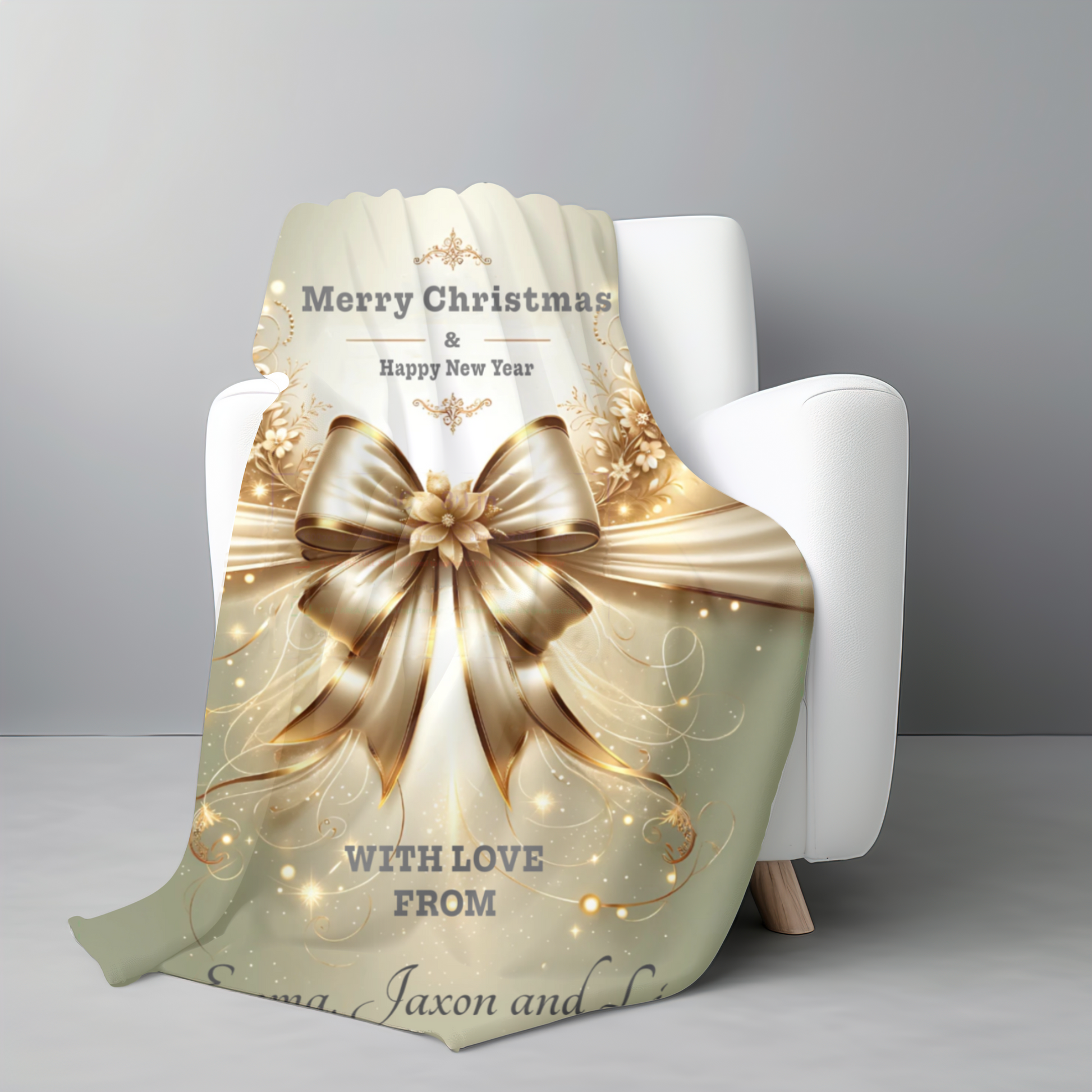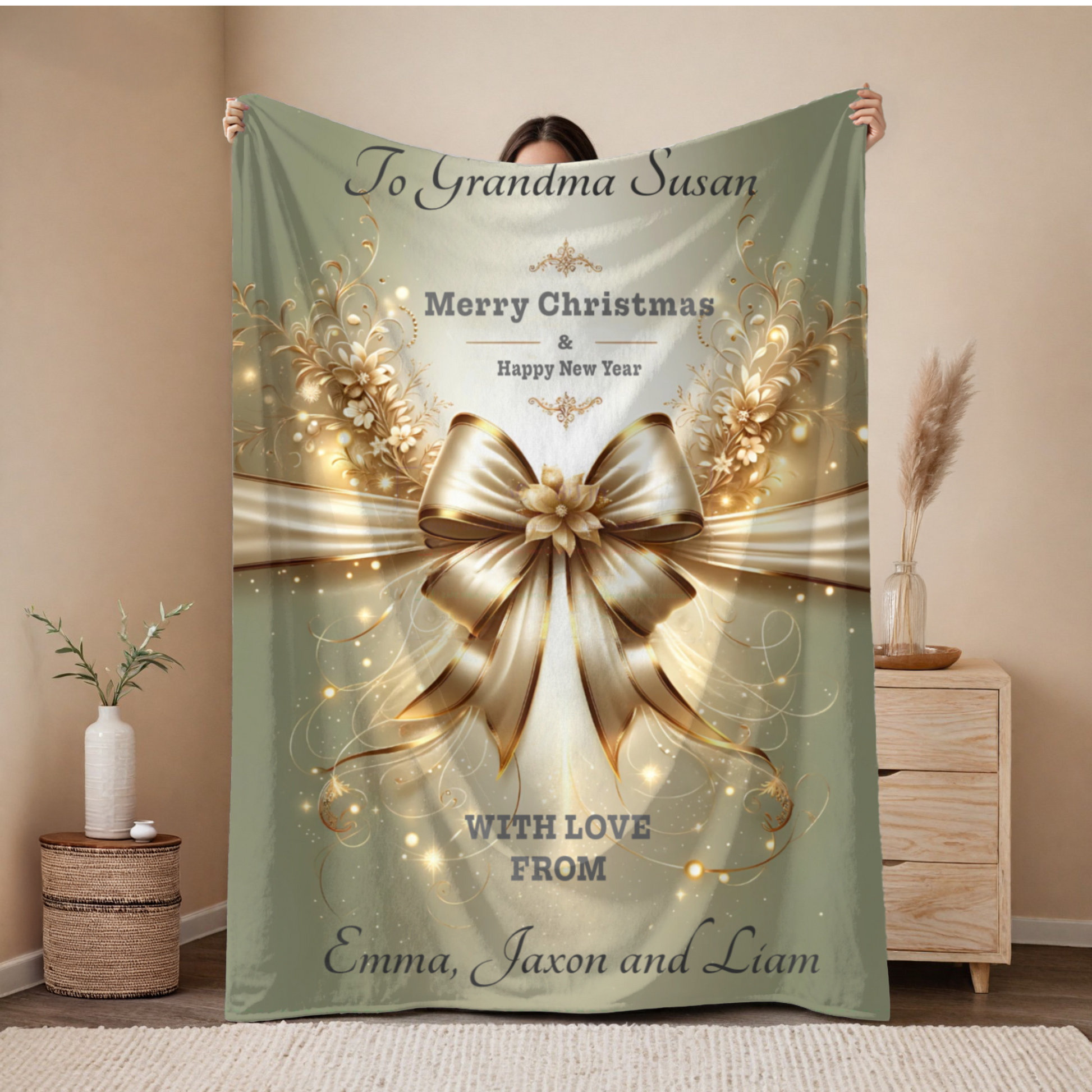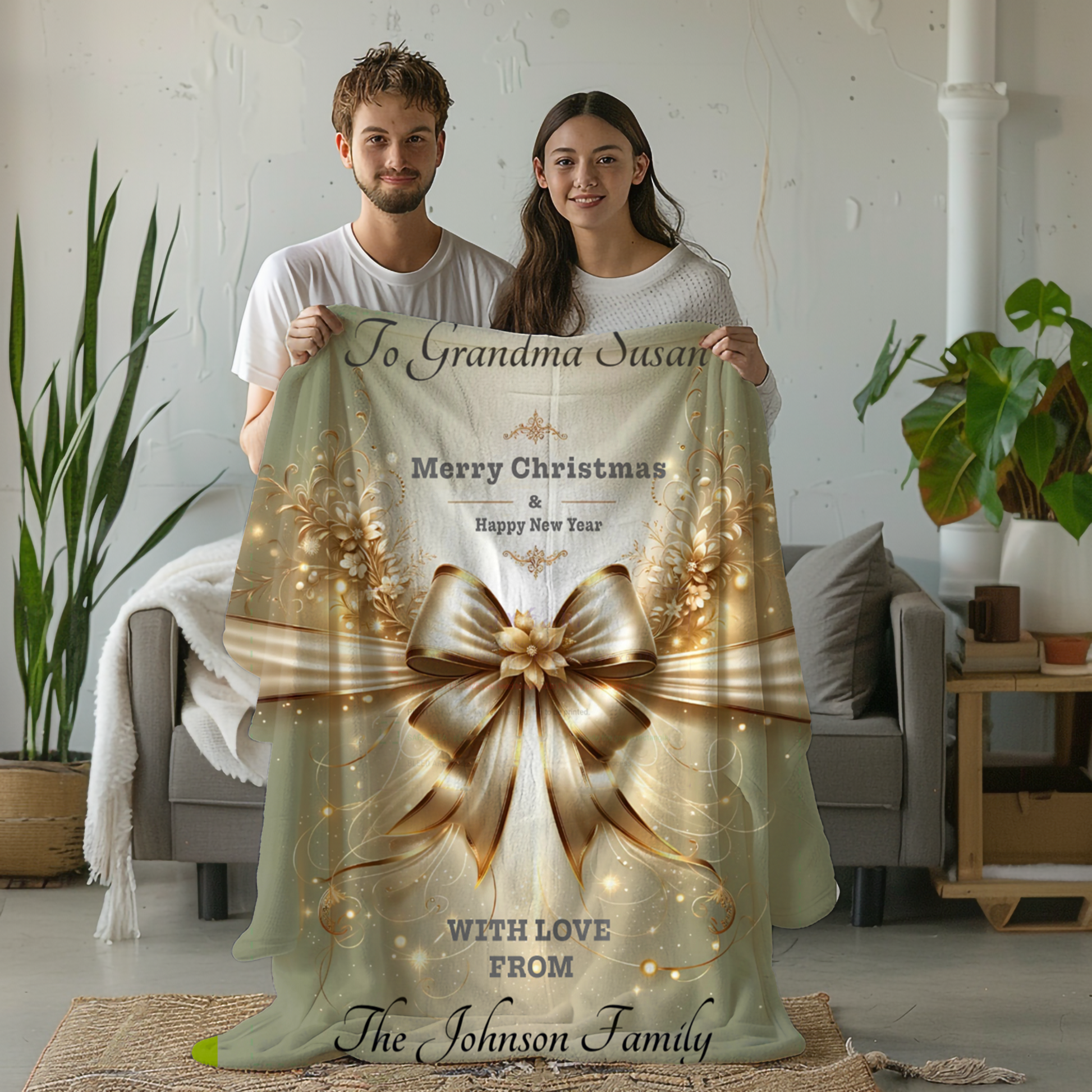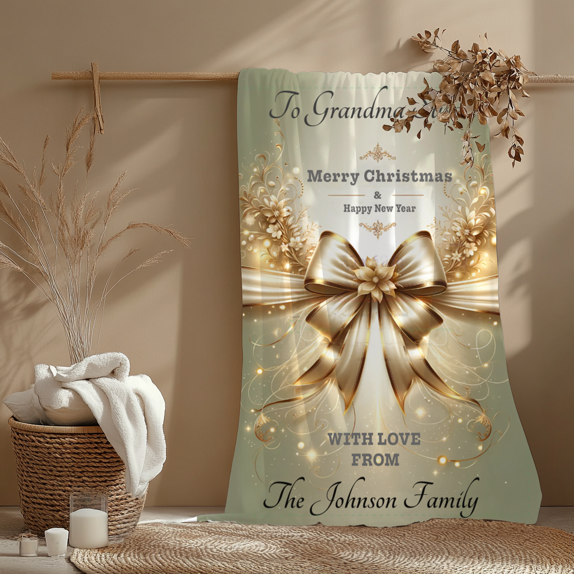 Celebrate the season with a personalized Christmas blanket designed to warm hearts and homes. Featuring a luxurious gold bow and elegant sparkles, this cozy velveteen throw includes your custom names and greeting line—perfect for Grandma, Mom, Nana, or any special person on your list.